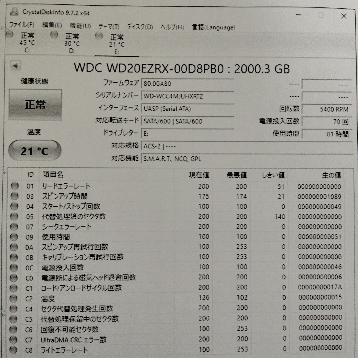 HDD 2TB 使用時間81H ハードディスク Crystal DiskInfo 正常 #118 / Western Digital WD Green / WDC WD20EZRX-00D8PB0