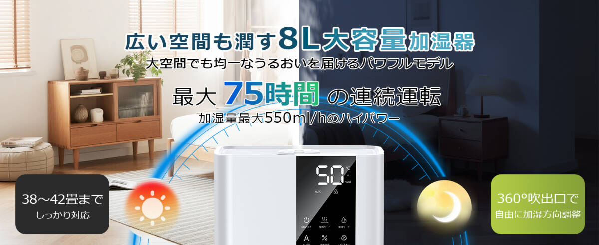 • 【8L大容量 加湿器&75時間連続作動&最大加湿量550ml/h】8Lの大容量タンクは、満水状態で最長75時間もの連続稼働が可能で、頻繁な給水の手間を大幅に減らします。550ml/hの高出力ミストが部屋全体に素早く広がり、広範囲にわたる加湿が実現可能です。また、360°回転の吹き出し口で方向をより自由に調節可能。狙った場所へ効率よく加湿できます。また、1〜12時間の入切タイマー機能を搭載しているので、就寝前や外出時も自動で加湿をオン・オフ。無駄な電力消費を防ぎ、快適な湿度環境を提供します。