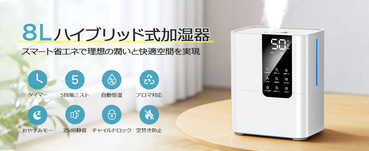 加湿器 大容量 8L 【AIスマート恒湿&多重除菌】 超音波式 卓上 ハイブリッド式加湿器 加熱式 100℃高温除菌 マイナスイオン UV除菌 上から給水 75時間連続作動 最大加湿量550ml/h 360度吹出口 5段階加湿 1~12時間入/切タイマー 静音 チャイルドロック 空焚き防止 水漏れ防止 次亜塩素酸水対応 省エネ 寝室/事務所/オフィス用/家庭用 リモコン付き