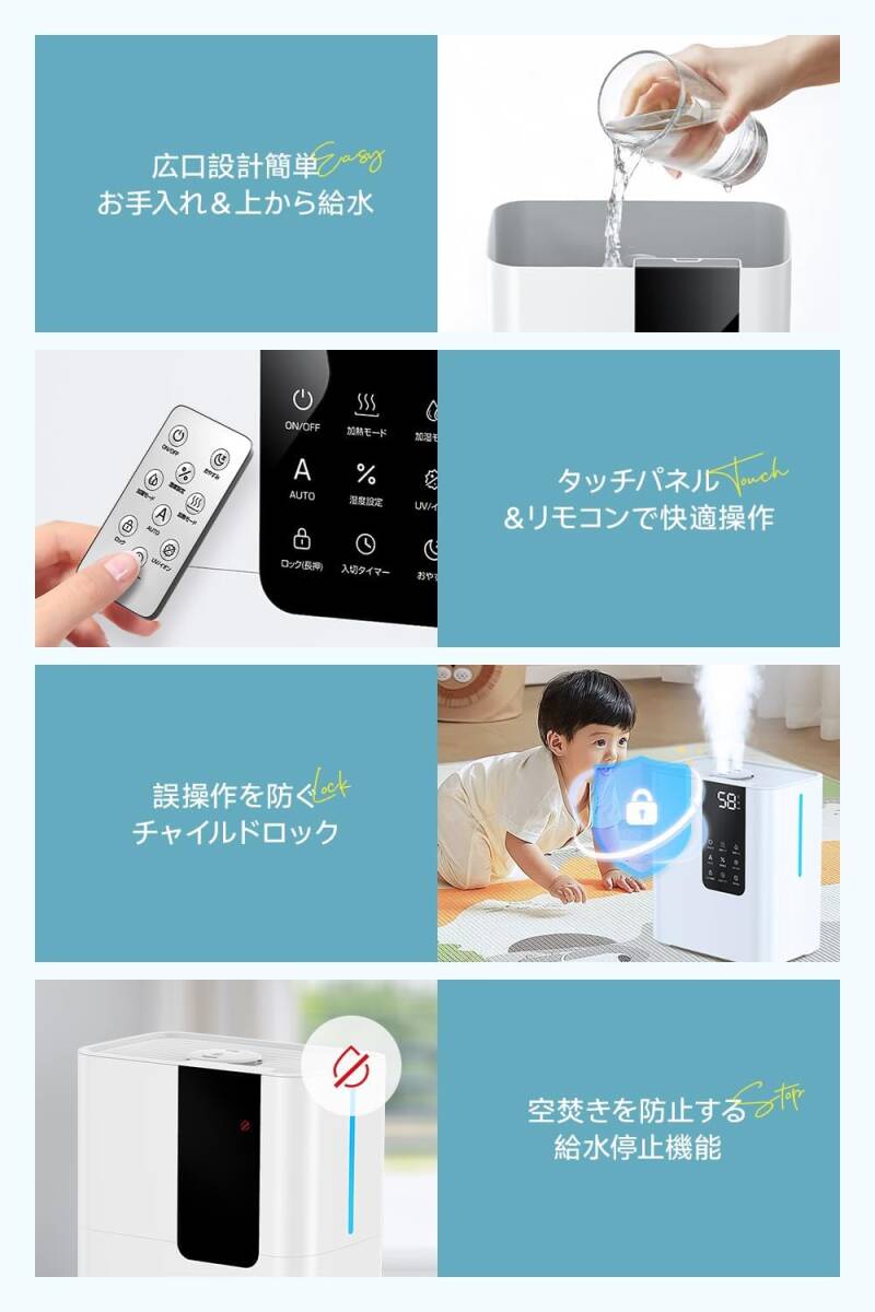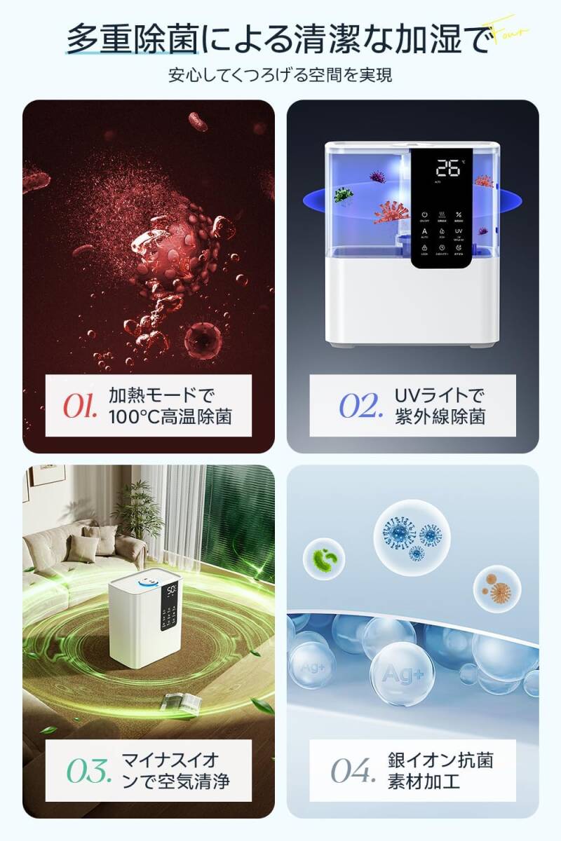 • 【ハイブリッド式加湿器&100℃高温除菌& UV除菌&マイナスイオン 】「加熱式 + 超音波式」のダブルテクノロジーを使用するハイブリッド式加湿器です。加熱により水を高温で殺菌し、清潔な蒸気を生み出します。UV-Cライトが水中の細菌やウイルスを効果的に除去し、微生物の繁殖を防ぎます。また、抗菌素材が細菌の繁殖を抑制し、長期間清潔な状態を維持します。さらに、マイナスイオンを放出することで空気中の浮遊物質を除去し、リラックス効果をもたらしながら快適な室内環境を実現します。家族みんなが安心して過ごせる、理想的な加湿器です。