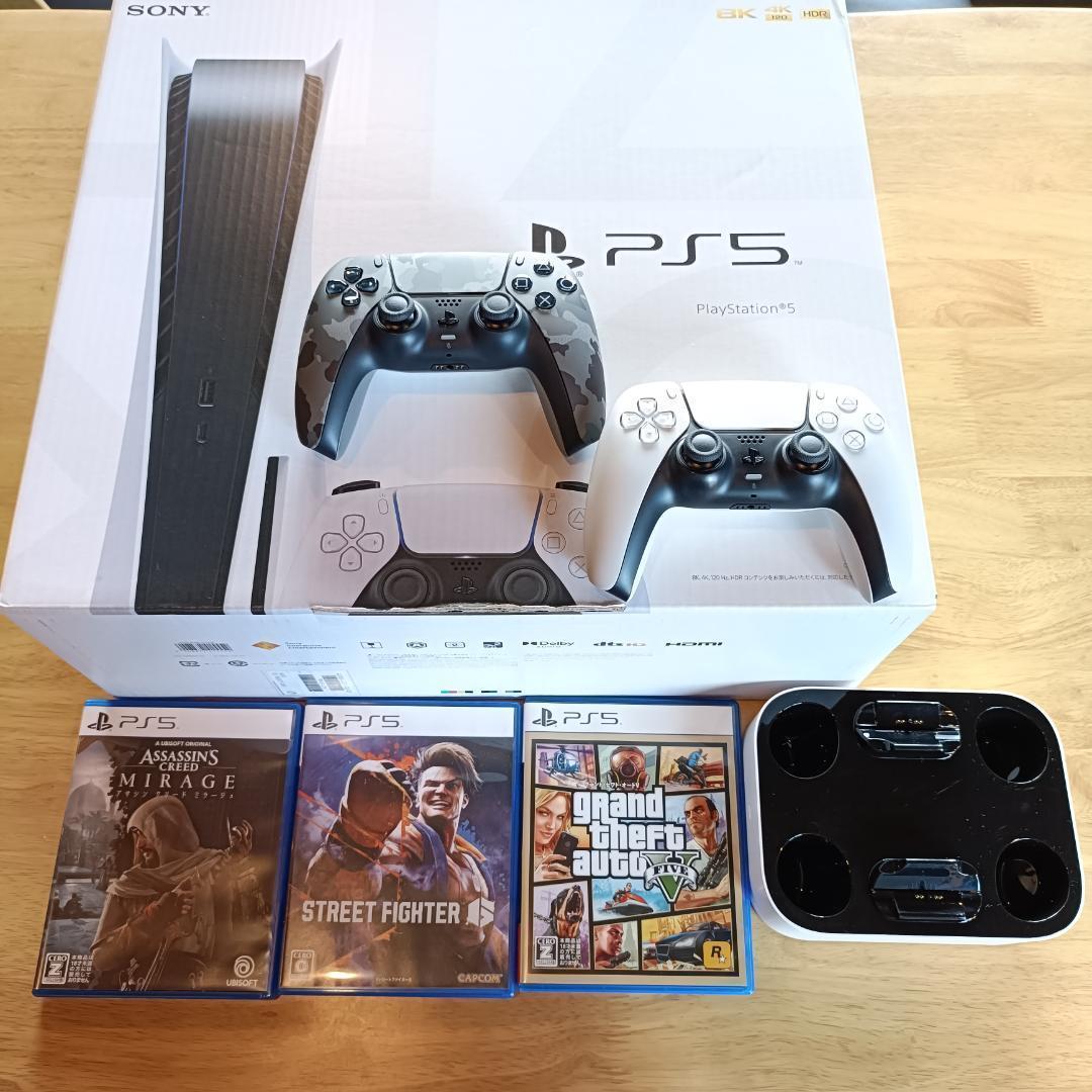 SONY PlayStation5(825GBモデル)の豪華セットです。昨年1月頃に購入し、リビング用として保管していましたが、使用頻度が少ないため出品いたします。