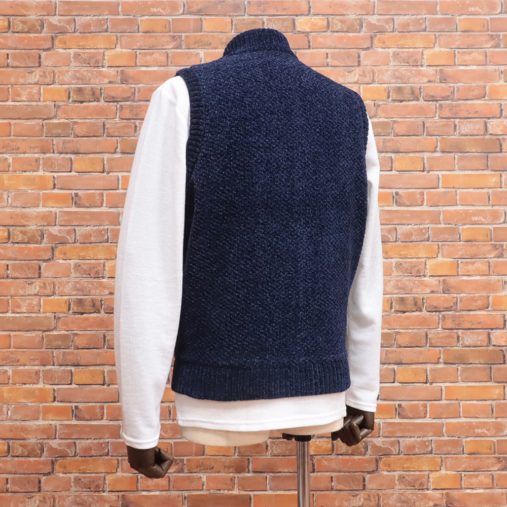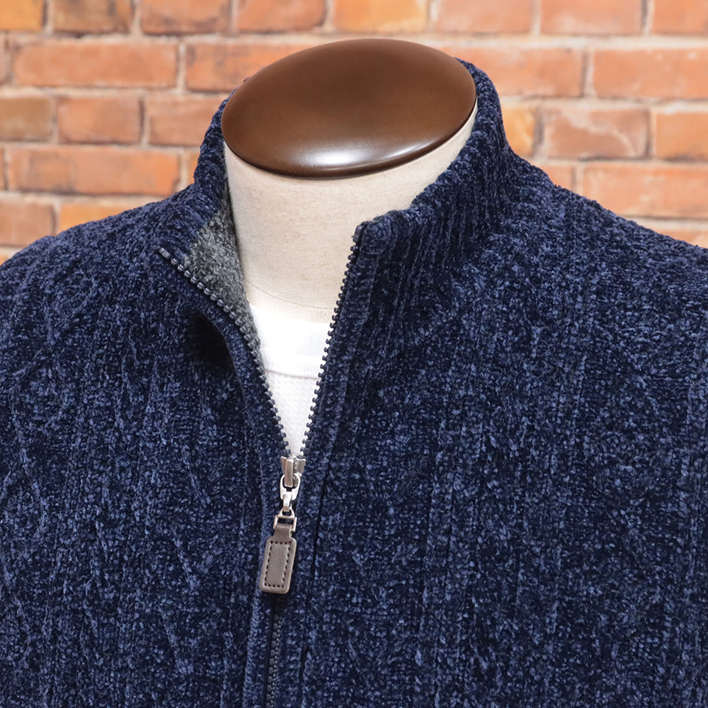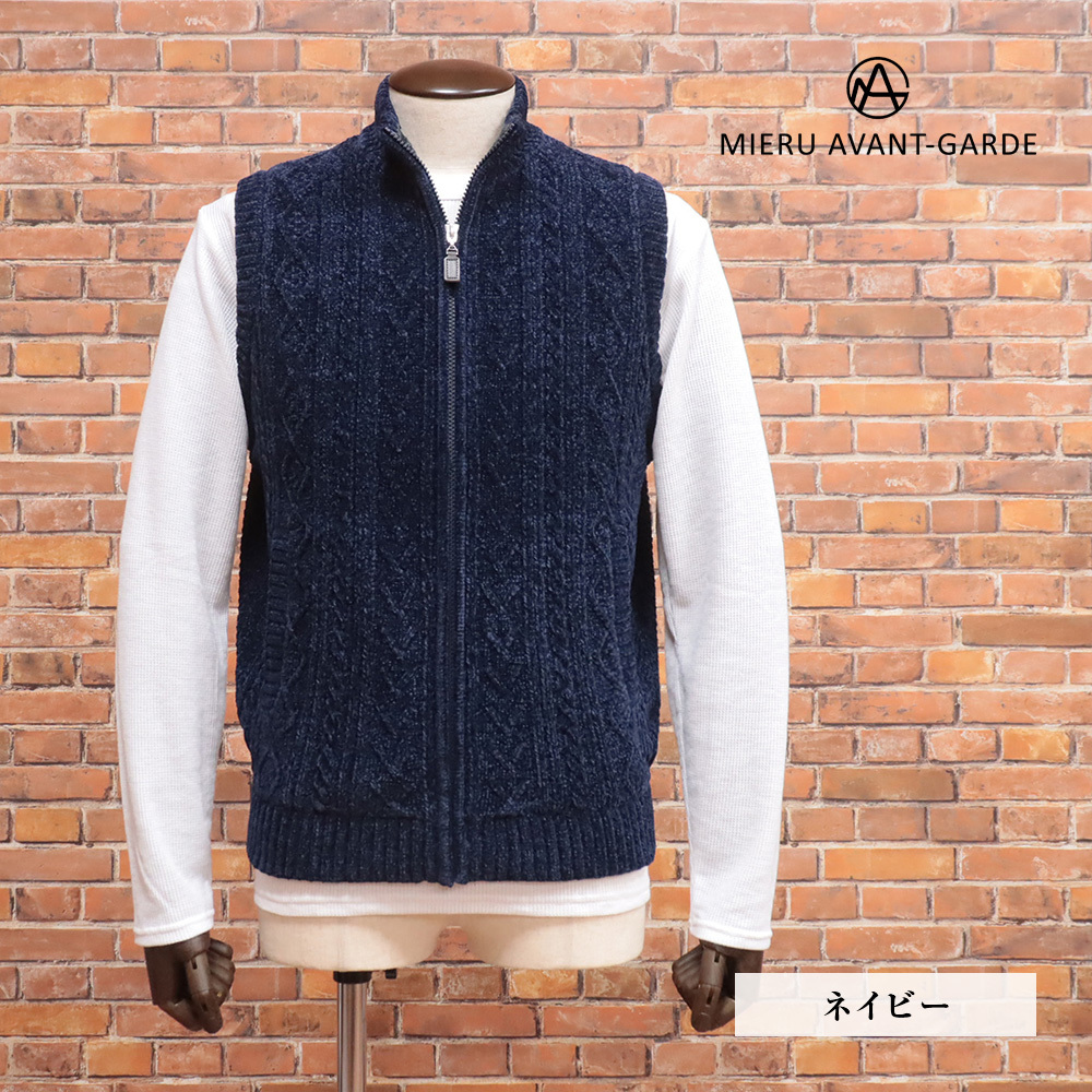 モコモコ感が際立つモールニット素材を使用した、シーズンムードたっぷりのジップベスト。やわらかな手触りとケーブル編みの立体感が上品さを添えています。