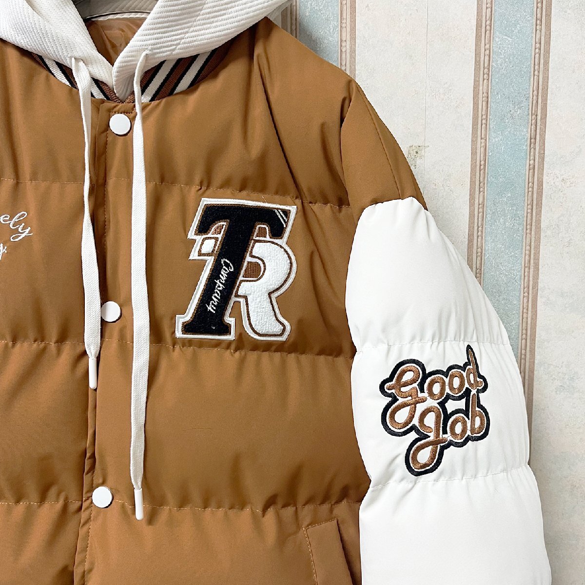 パーカーとスタジャンをレイヤードしたようなドッキングデザインのジャケット。ゆったりしたシルエットで、体型カバーできて、爽やかな印象を与えてくれます。フードは取り外し不可で、またはフードサイズを調整できるドローコードが付き、防寒防風性がUP。両側にポケットがあり、携帯電話や鍵などの小さなアイテムを入れることができます。