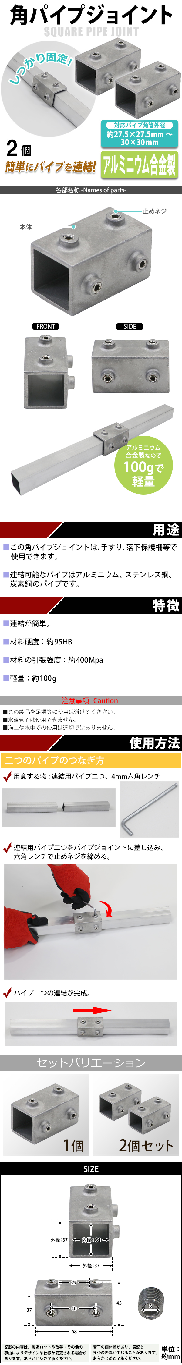 | 商品名 | 送料無料 パイプジョイント 角パイプ 2個 パイプクランパー スリーブジョイント 連結 ジョイント パイプ 配管 単管 対応パイプ角管外径約27.5×27.5~30×30mmパイプ用 アルミニウム合金製 パイプつなぎ パイプ継ぎ ネジ止め 軽量 DIY 延長 簡単組み立て sqpjointdst |