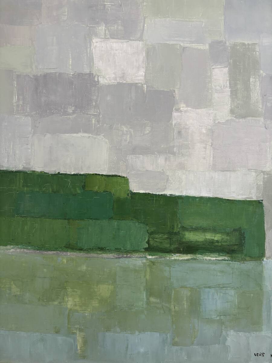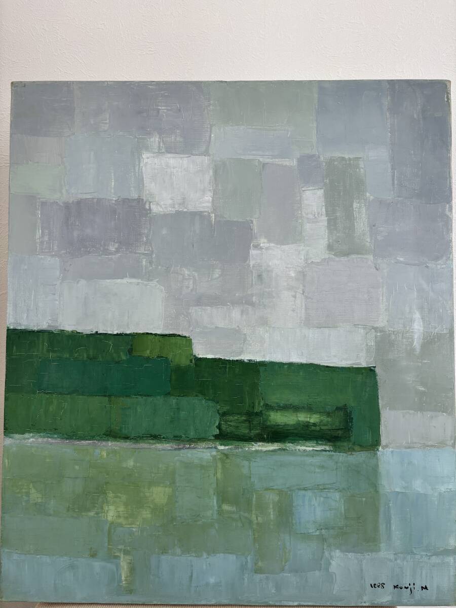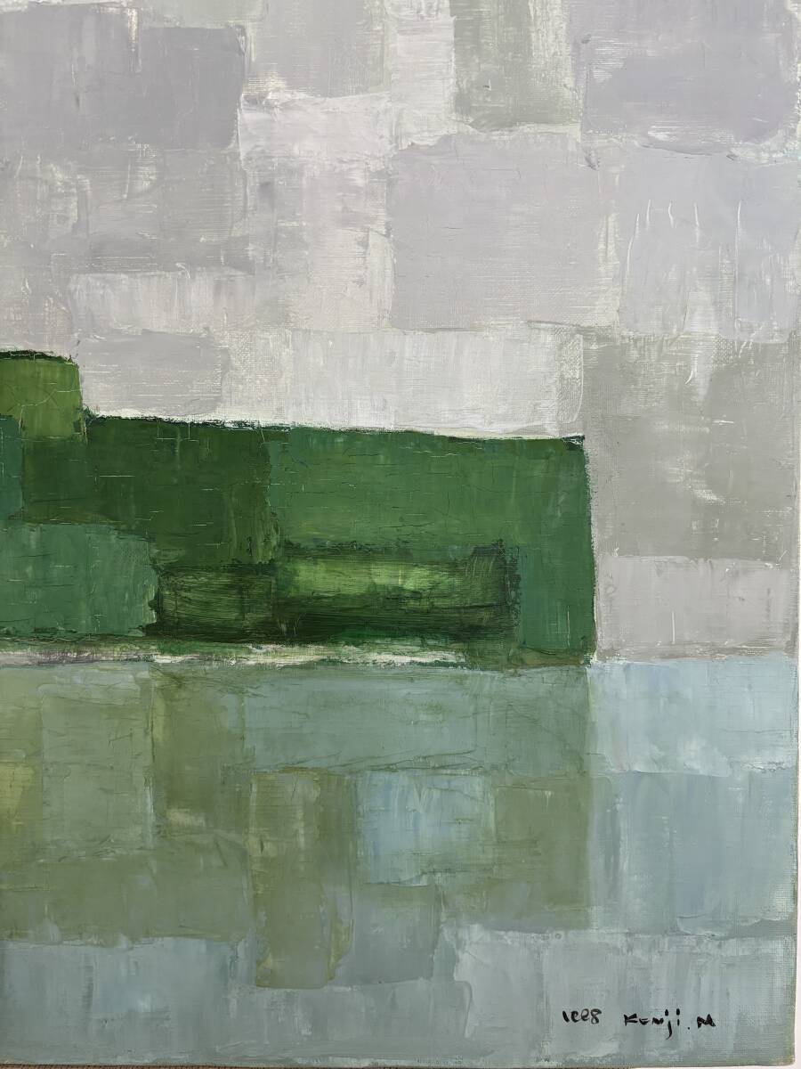 穏やかな水平ラインと淡いグリーンの色調が美しい、抽象的な風景を描いた油彩作品です。
