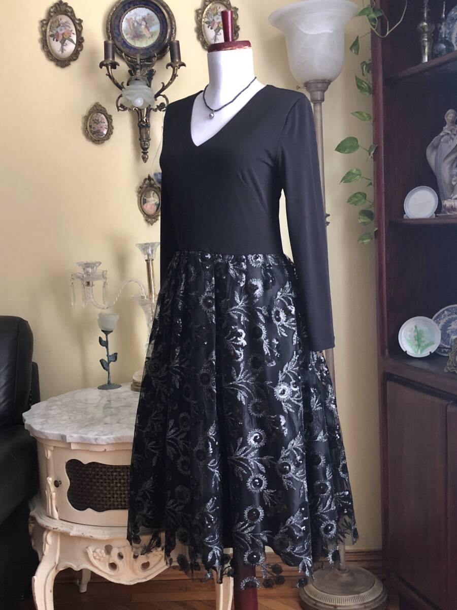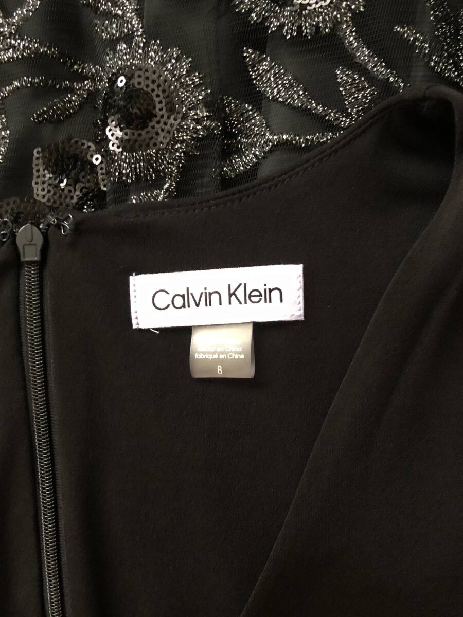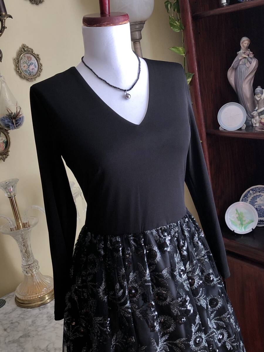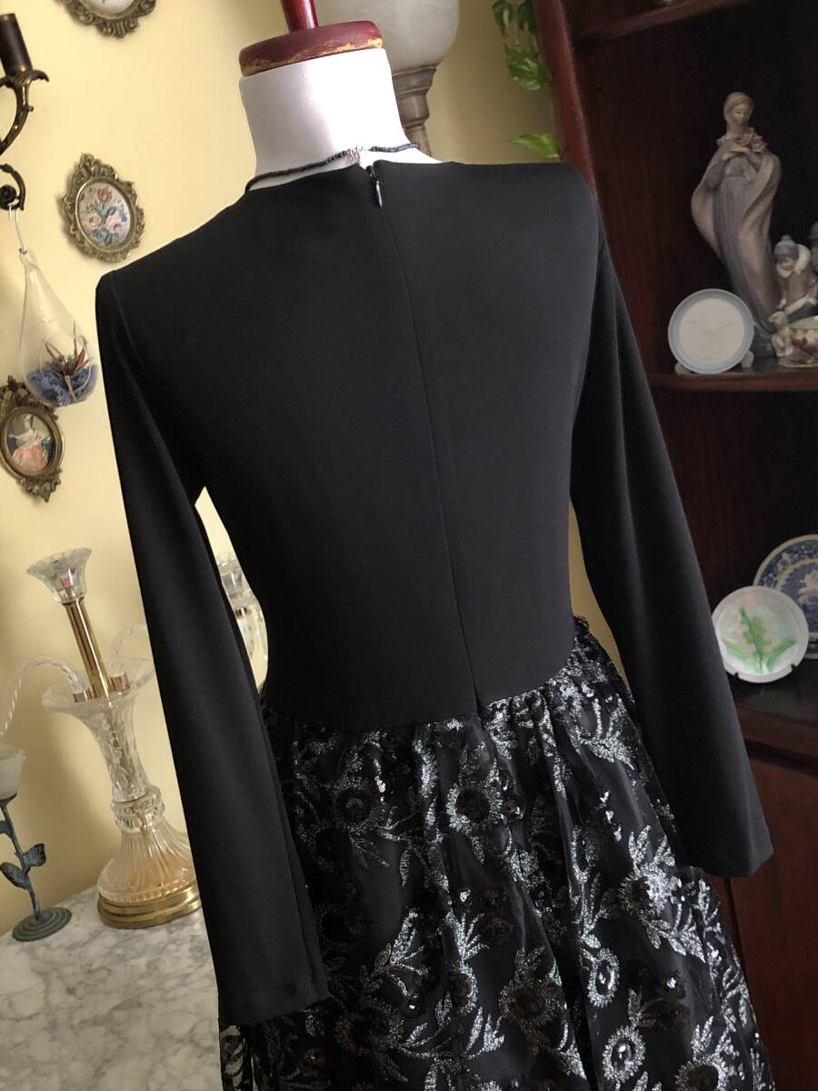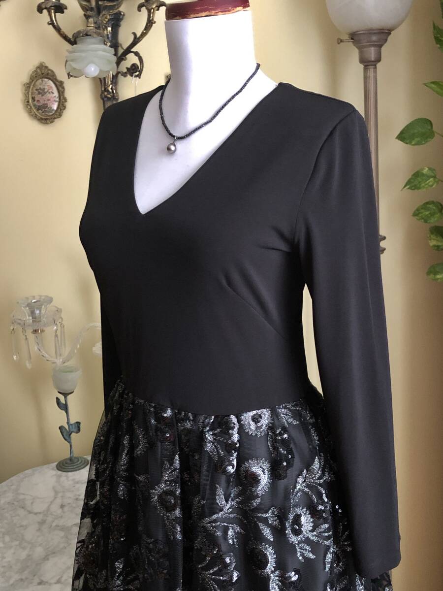 | 【Calvin Klein】より、素敵なカクテルドレスです。 黒のストレッチトップとチュールのスカートが素敵です。 銀糸と黒のスパンコールのお花の刺繍が綺麗ですね。 スカートは裏打ち布と裏地の間にチュールーが入ってふんわり感があります。 上身は同素材の裏地が付いています。 後ファスナーで開きます。 【状態】新品 【ブランド】Calvin Klein 【サイズ】表示サイズ/us(アメリカ)8 日本対応サイズ目安/ 11号サイズぐらい *個人差がございます。必ず採寸をご参照ください。 【採寸】平置き採寸です。 肩幅40㎝、身幅47㎝、ウエスト38cm、着丈112cm(上身丈42㎝+スカート丈70cm)、袖丈55㎝ *上身のみストレッチします。 【カラー】黒、シルバー 【素材】ポリエステル95%、スパンデックス5% ポリエステル100% 【裏地の素材】ポリエステル100% 【着脱】後ファスナー