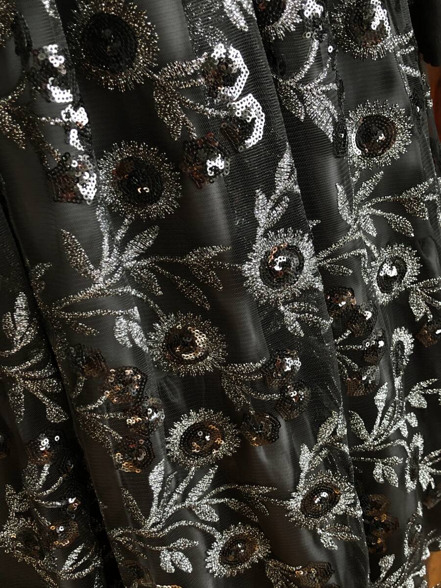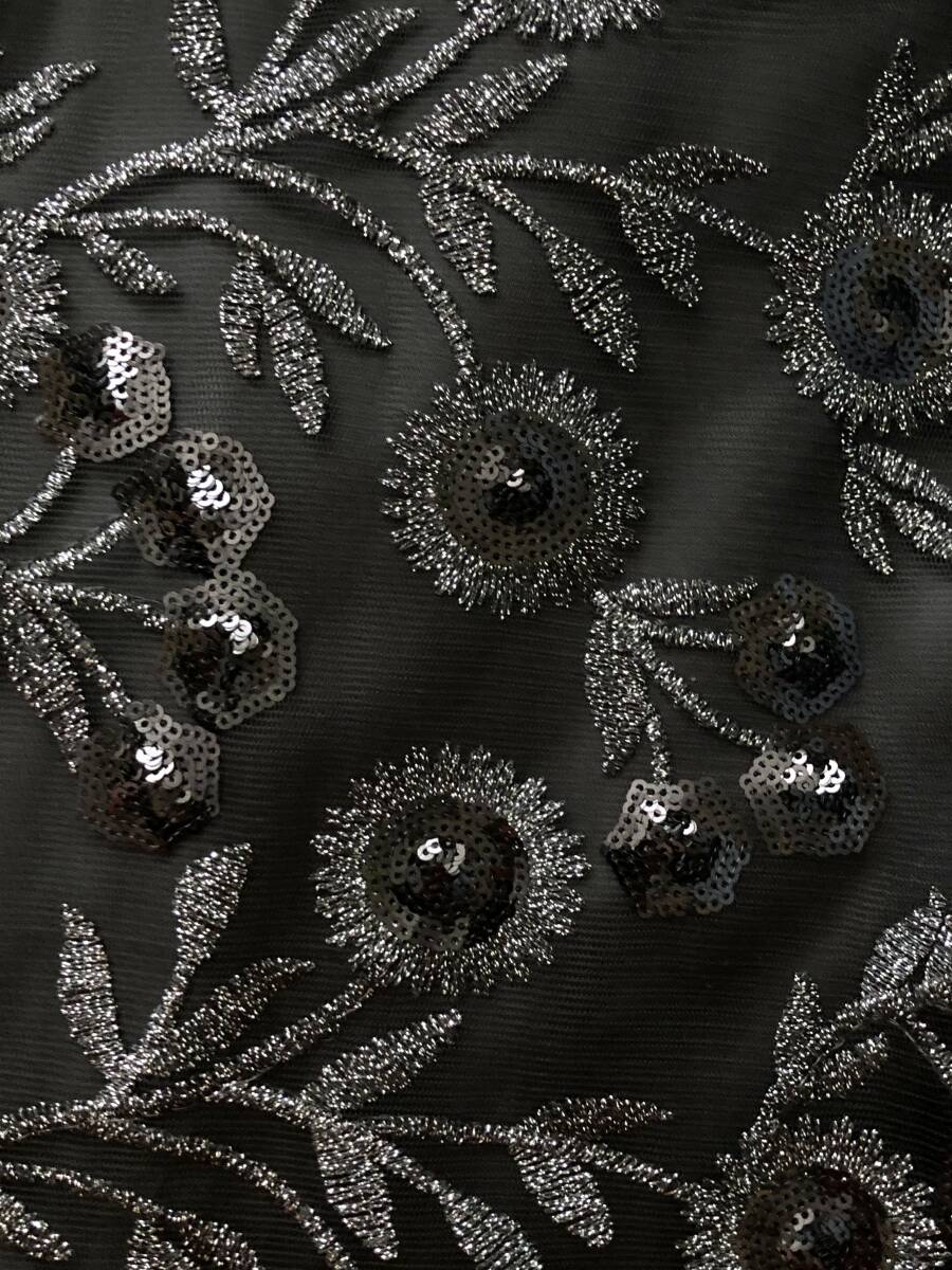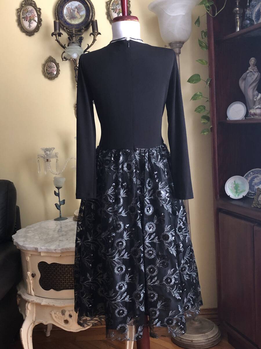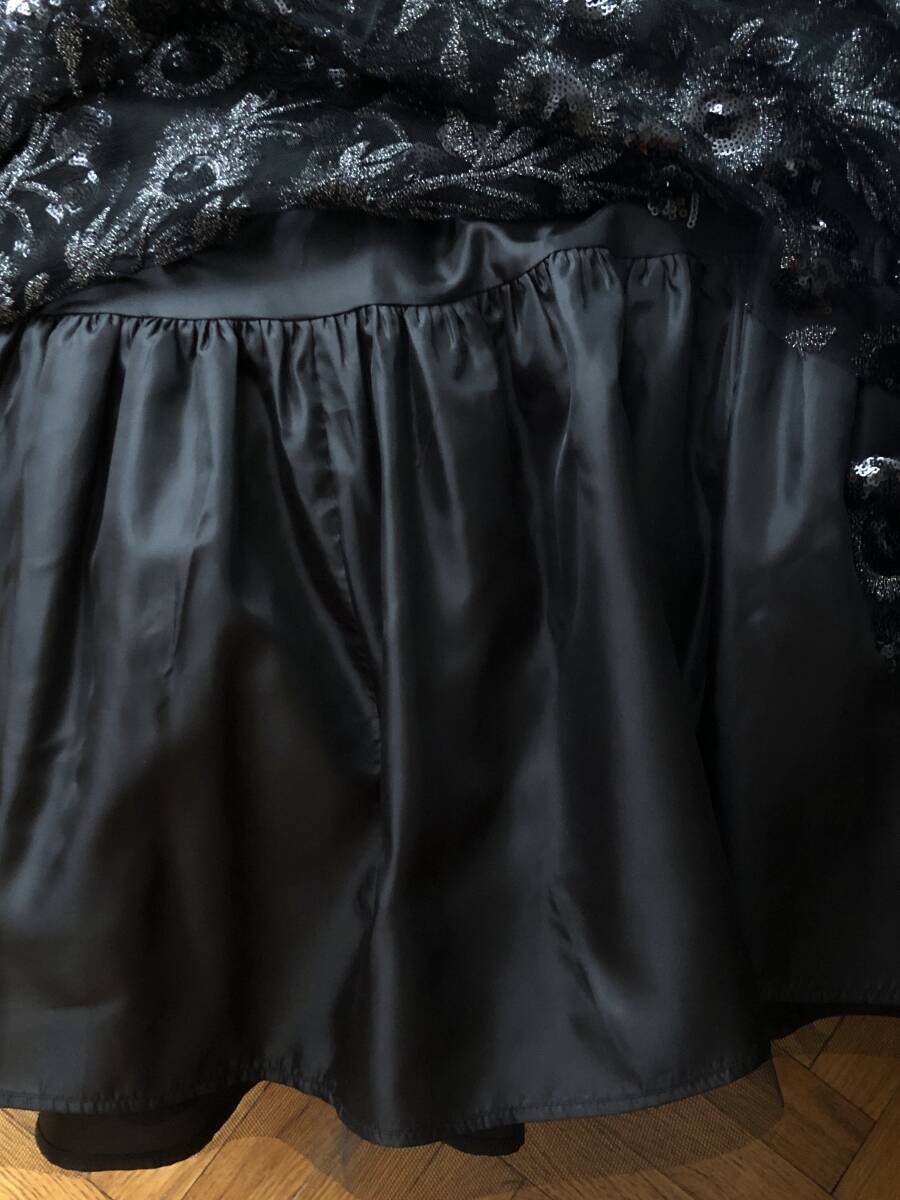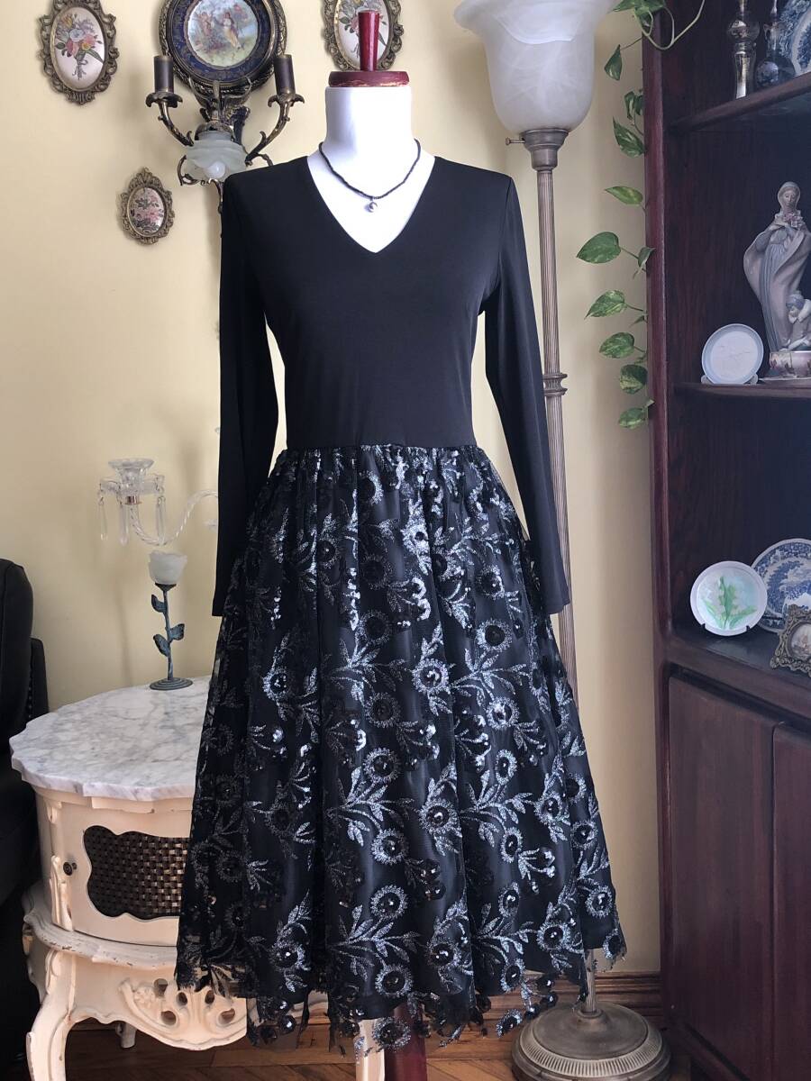 | 【Calvin Klein】より、素敵なカクテルドレスです。 黒のストレッチトップとチュールのスカートが素敵です。 銀糸と黒のスパンコールのお花の刺繍が綺麗ですね。 スカートは裏打ち布と裏地の間にチュールーが入ってふんわり感があります。 上身は同素材の裏地が付いています。 後ファスナーで開きます。 【状態】新品 【ブランド】Calvin Klein 【サイズ】表示サイズ/us(アメリカ)8 日本対応サイズ目安/ 11号サイズぐらい *個人差がございます。必ず採寸をご参照ください。 【採寸】平置き採寸です。 肩幅40㎝、身幅47㎝、ウエスト38cm、着丈112cm(上身丈42㎝+スカート丈70cm)、袖丈55㎝ *上身のみストレッチします。 【カラー】黒、シルバー 【素材】ポリエステル95%、スパンデックス5% ポリエステル100% 【裏地の素材】ポリエステル100% 【着脱】後ファスナー