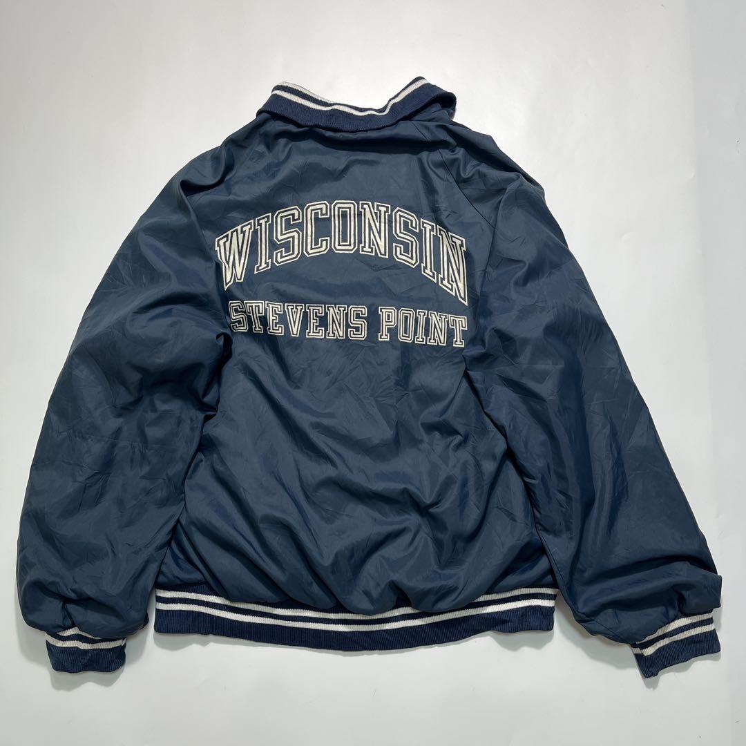 襟・袖・裾はリブライン仕様で、バックには「WISCONSIN STEVENS POINT」のカレッジロゴ入り。