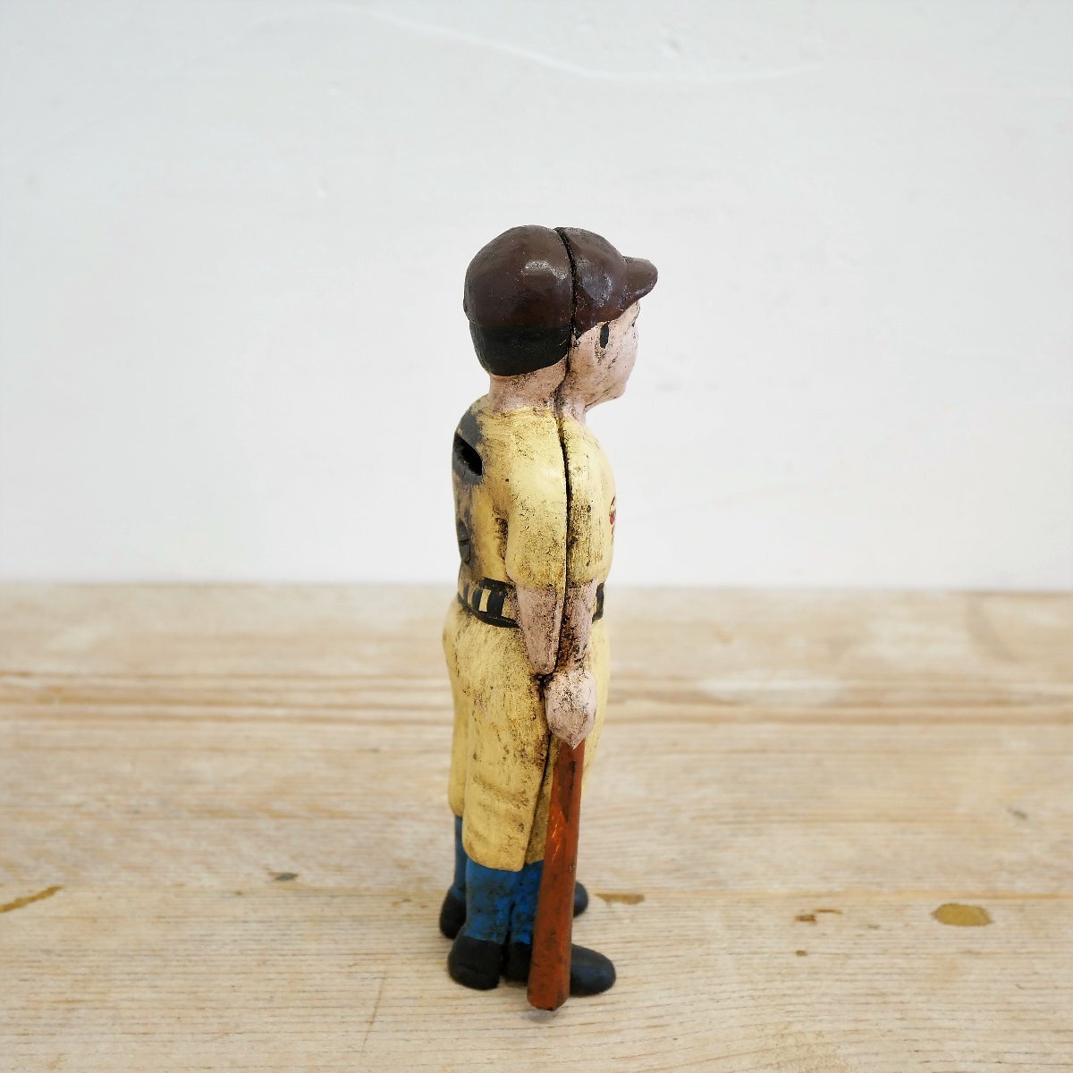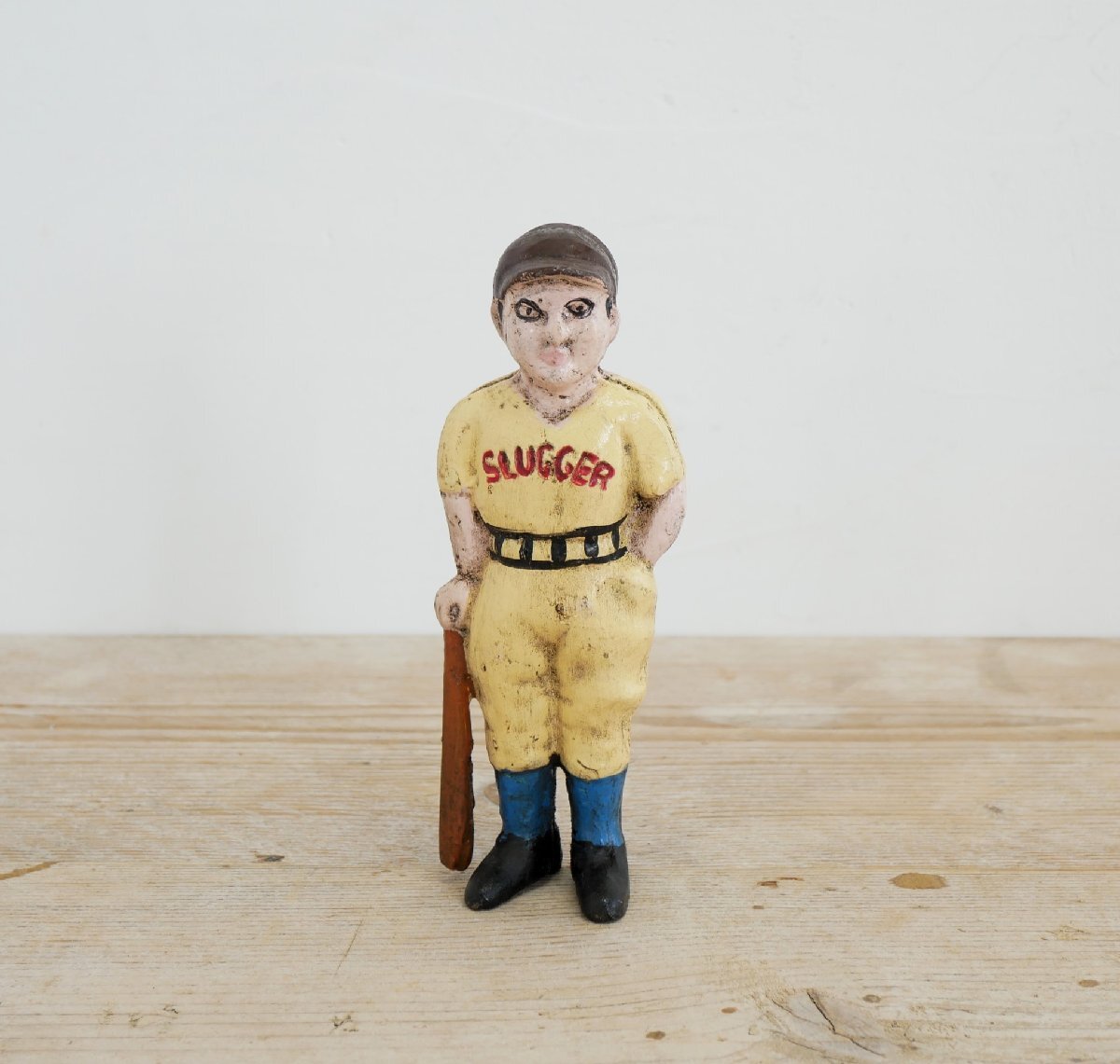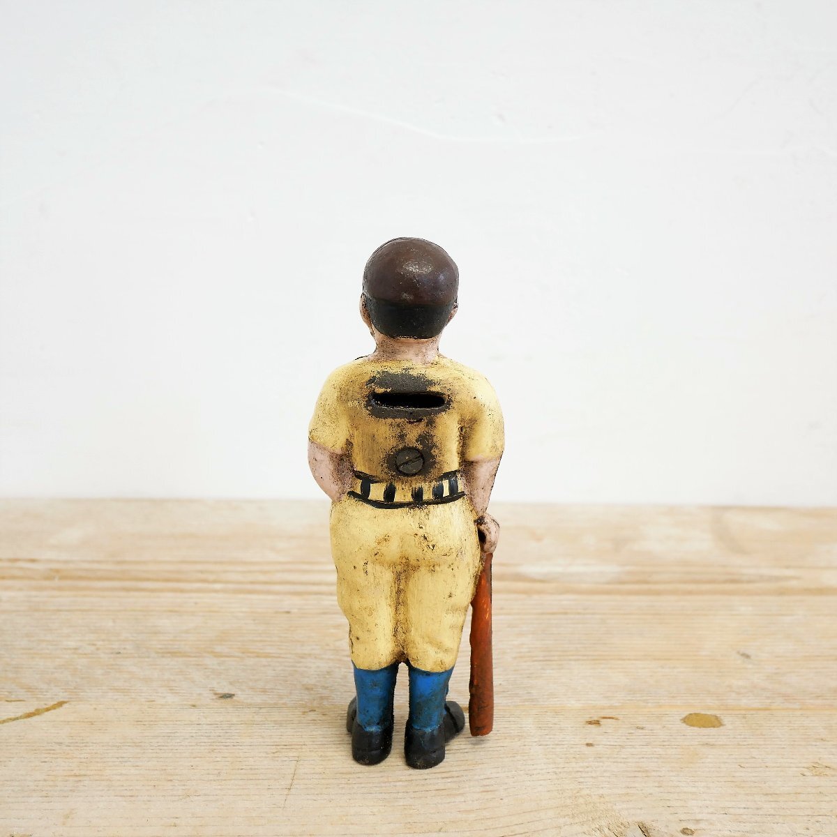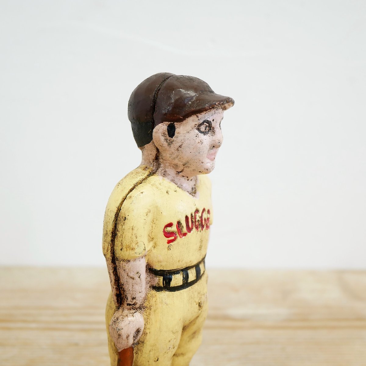| 商品説明 explanation | 野球選手を模した鋳物製の貯金箱です。 表情やフォルムなど、何とも言い表せない雰囲気があります。 材質:鉄の鋳物(キャストアイロン) ※年代不明 1セントコインは入りますが、日本の硬貨は入りません。 お洒落なアイテムを、インテリアのアクセントにいかがでしょうか。 |