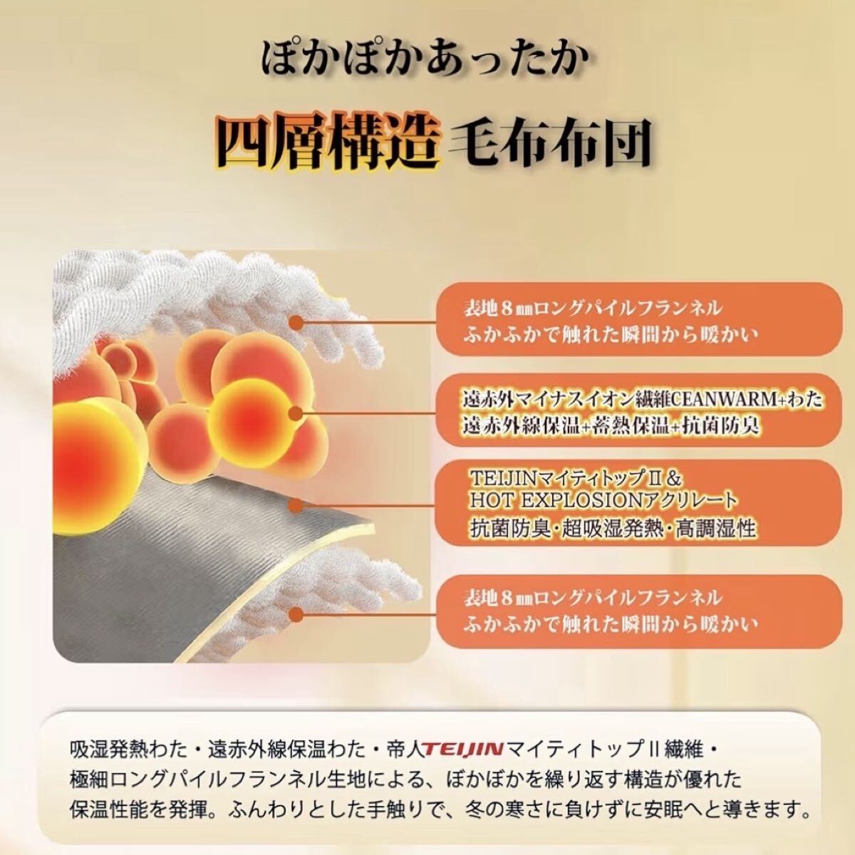 布団の側地は、軽くて暖かいフランネル素材、ふかふかと柔らかい、片面の毛足が8mmもあり、普通品より保温性が抜群です。