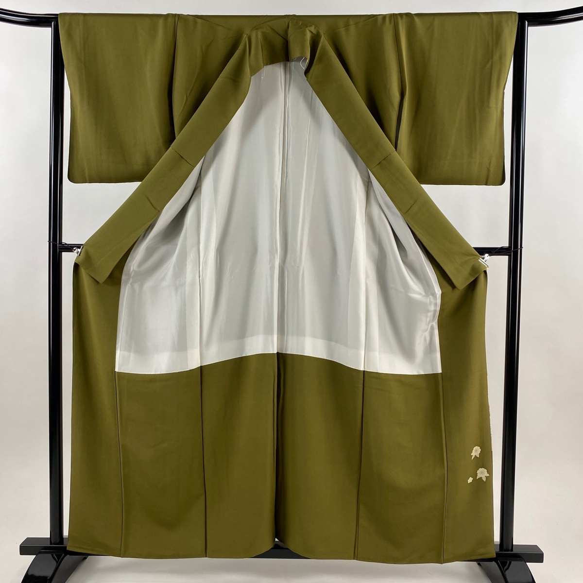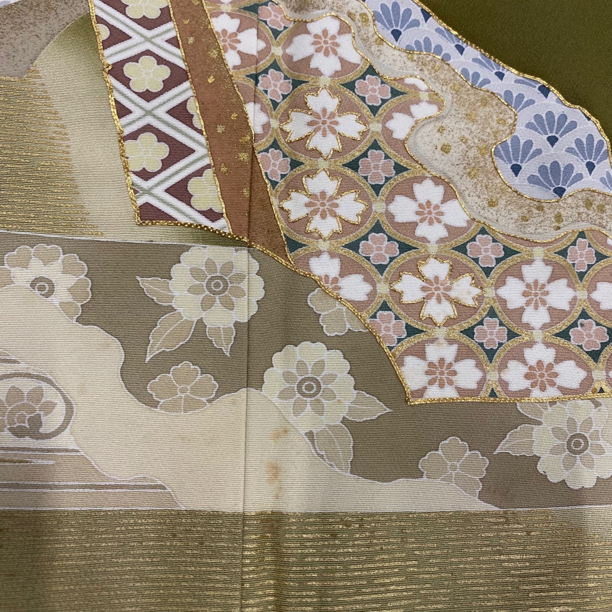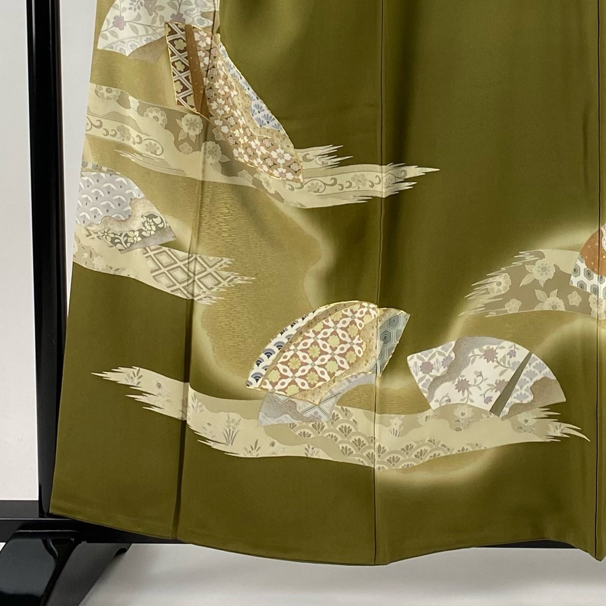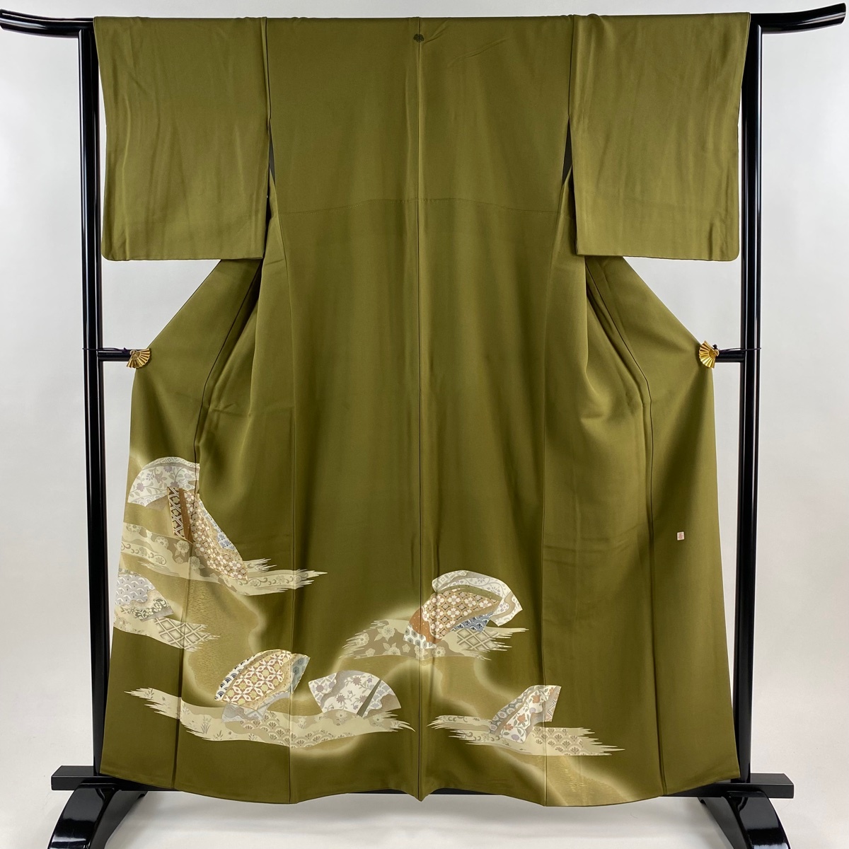| 色留袖 秀品 落款 扇面 草花 金糸 金彩 茶緑色 袷 身丈159 裄丈64 M 正絹 【中古】 |