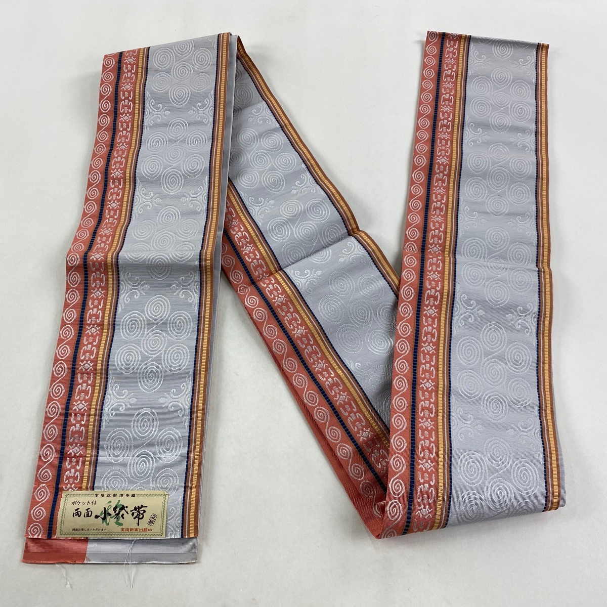 | 半幅帯 美品 秀品 証紙 本場筑前博多織 ポケット付 縞 幾何学模様 サーモンピンク 正絹 【中古】 |