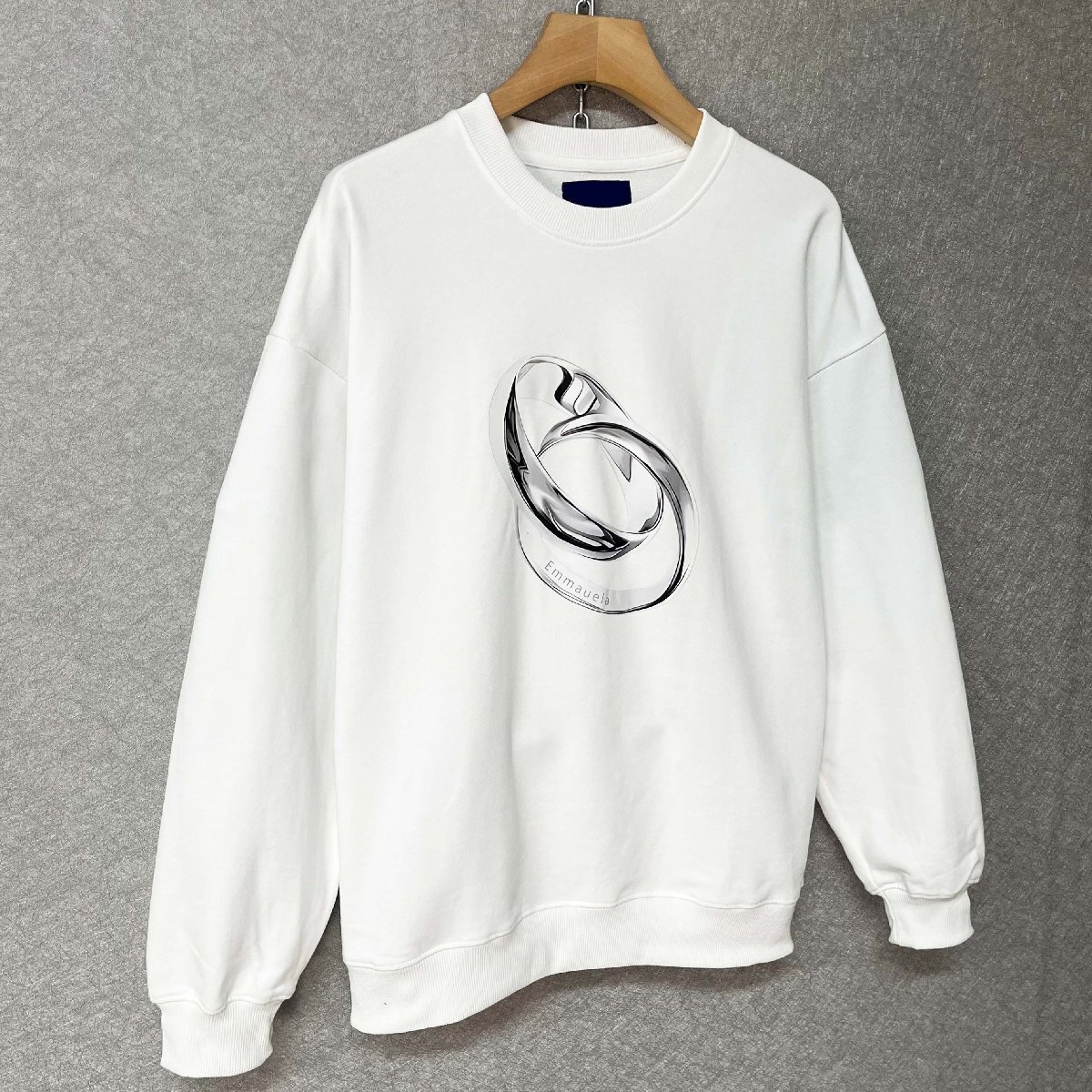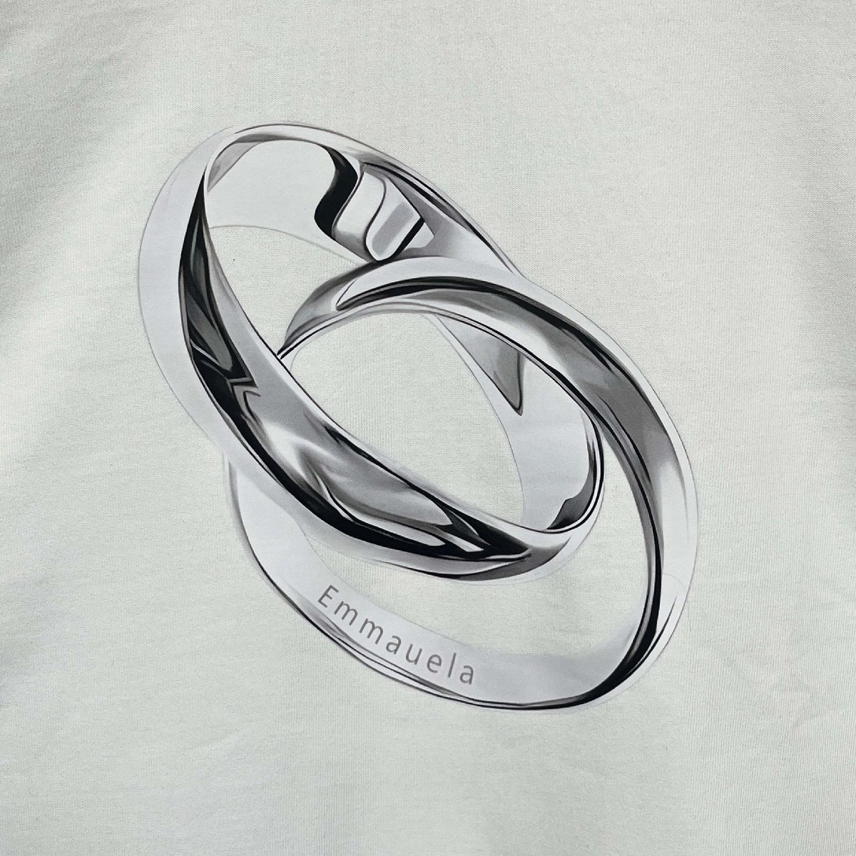 すっきりとしたシルエットとベーシックなラウンドネックデザインで、どんなスタイルにも合わせやすい万能アイテム。フロントにはシックなカップルリングのプリントが施されており、シンプルながらも洗練された印象を与えます。