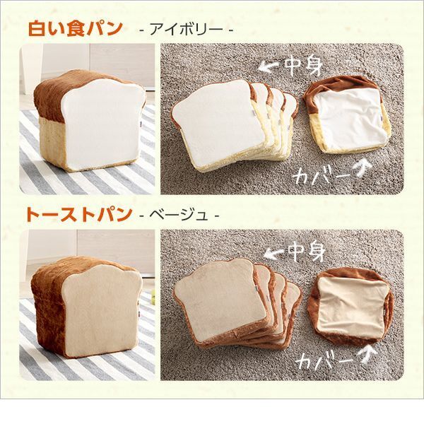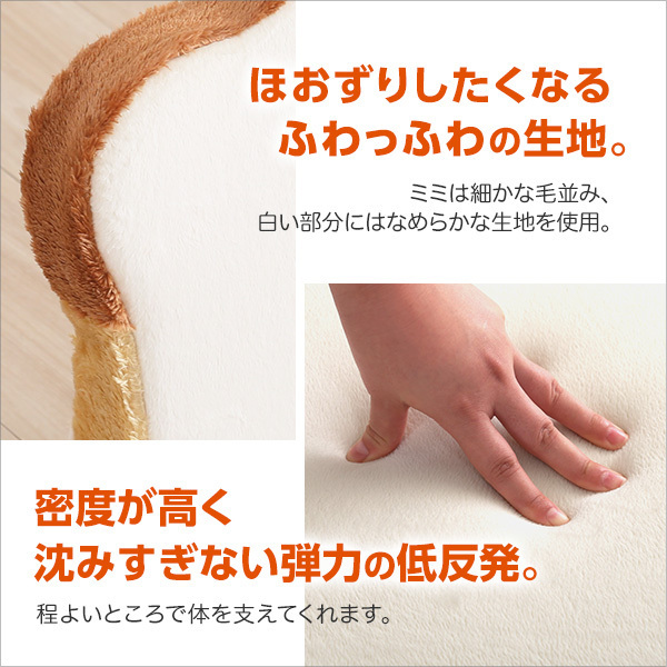 【ポイント】 おいしそうな食パン型クッションです。 安心の日本製だからギフトにも最適です。 沈み込みすぎない低反発クッションです。 肌ざわり抜群のカバーを外せば4枚切りのクッションに! ベーシックな白い食パンとトーストの2カラーがございます。 |