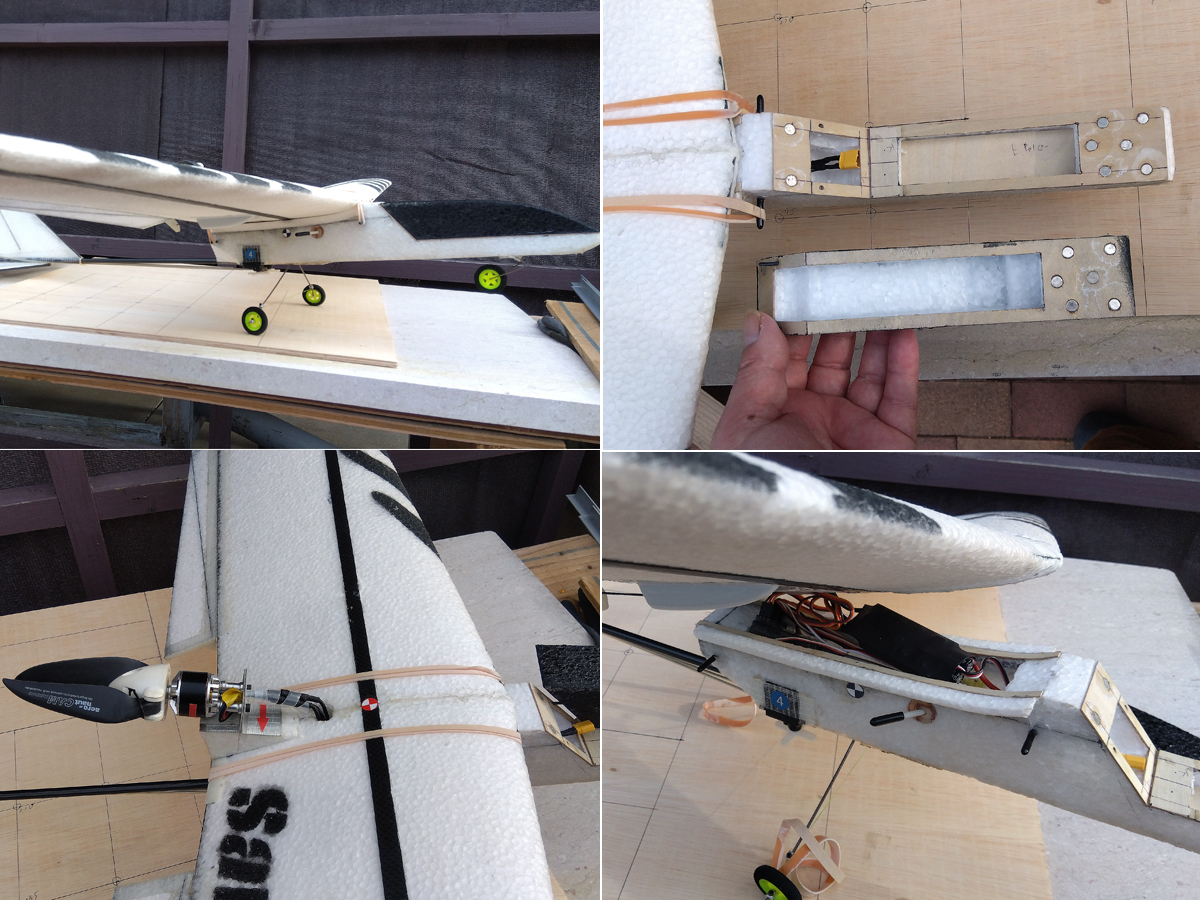 パッと見、EPP製の貧弱なモーターマウント基部ですが、カーボンロッド3本を通して機体と強力に接合。