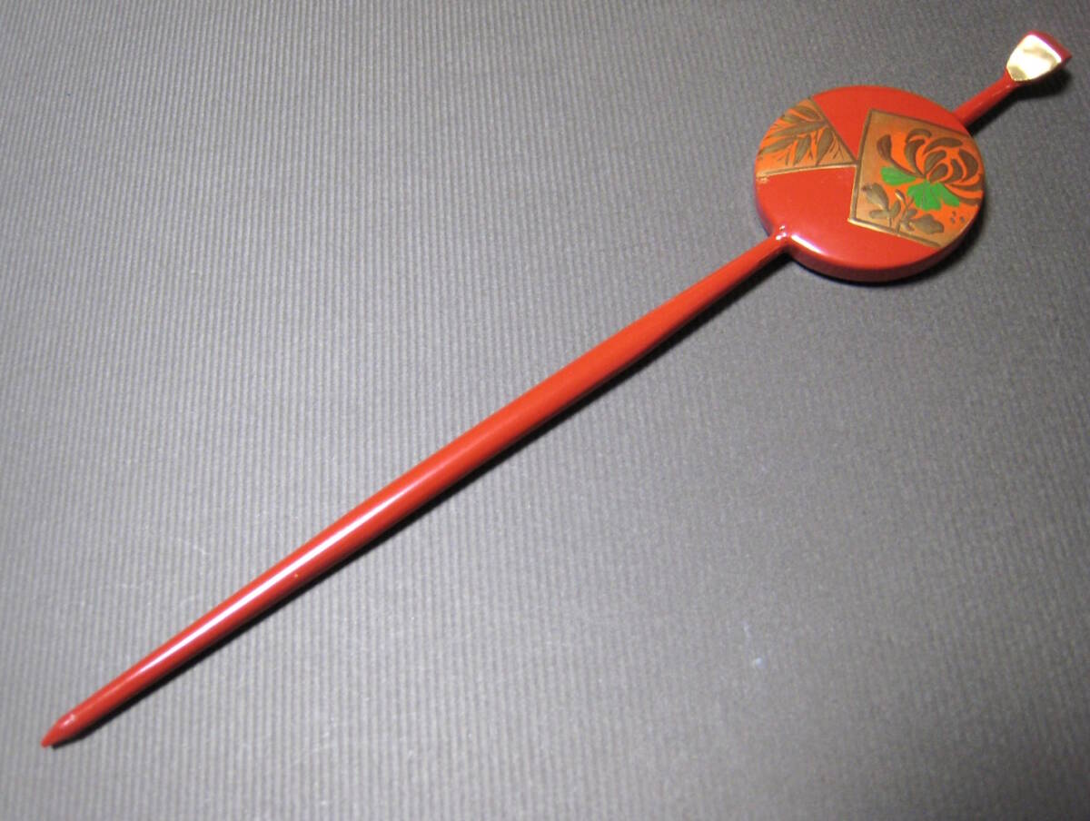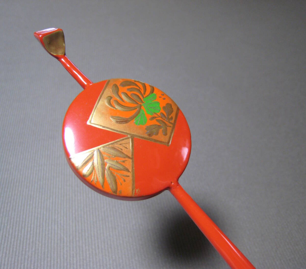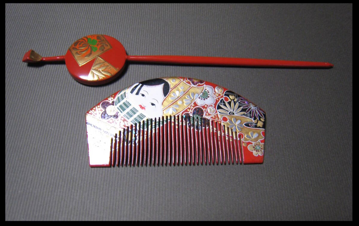 お多福さんと花の蒔絵に螺鈿飾りをあしらった木製朱塗りの可愛い飾り櫛と菊花と笹蒔絵の平簪です。