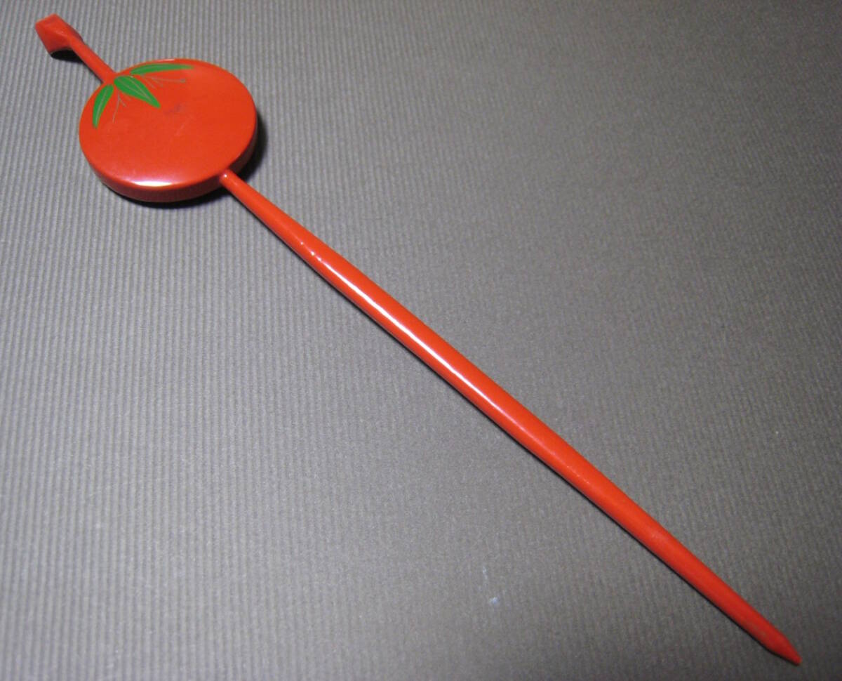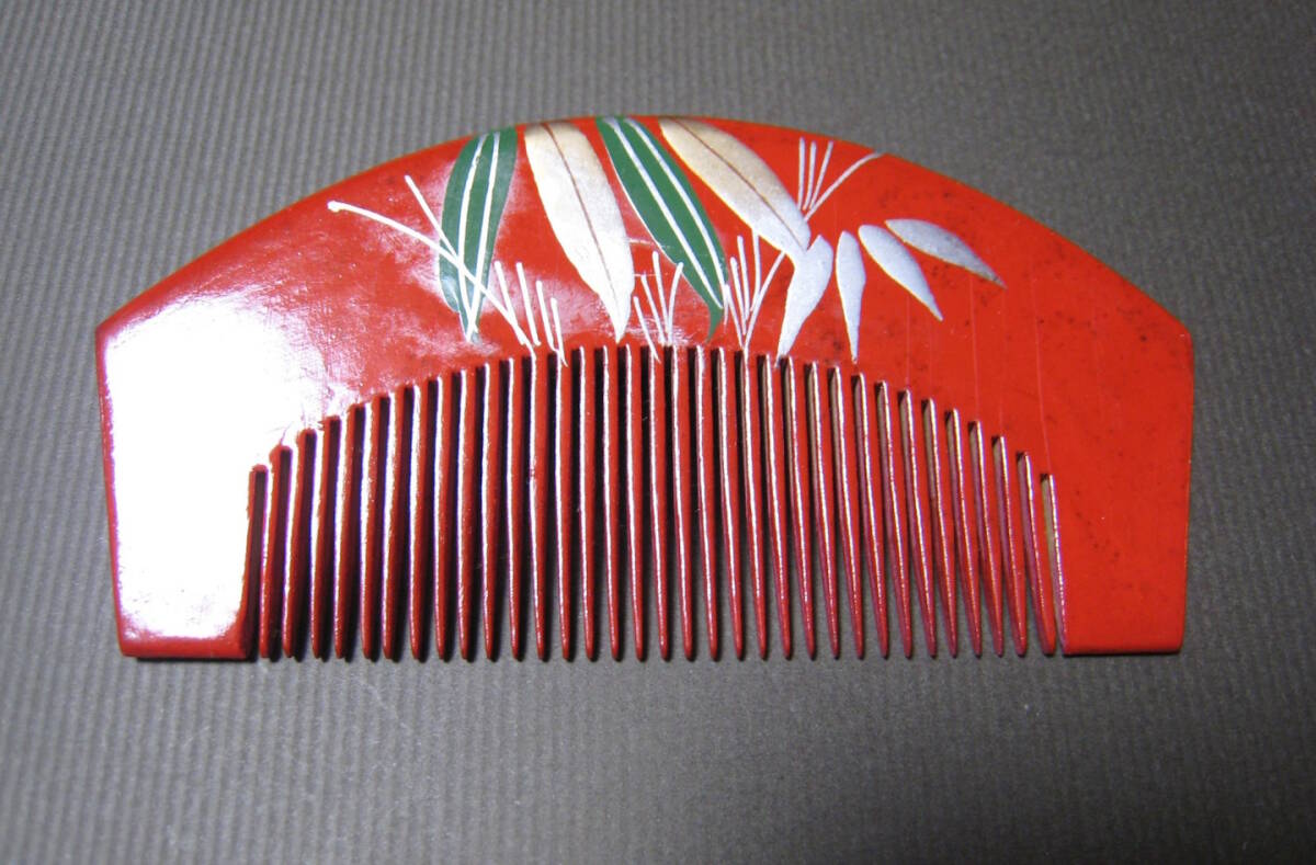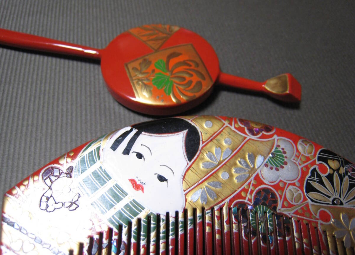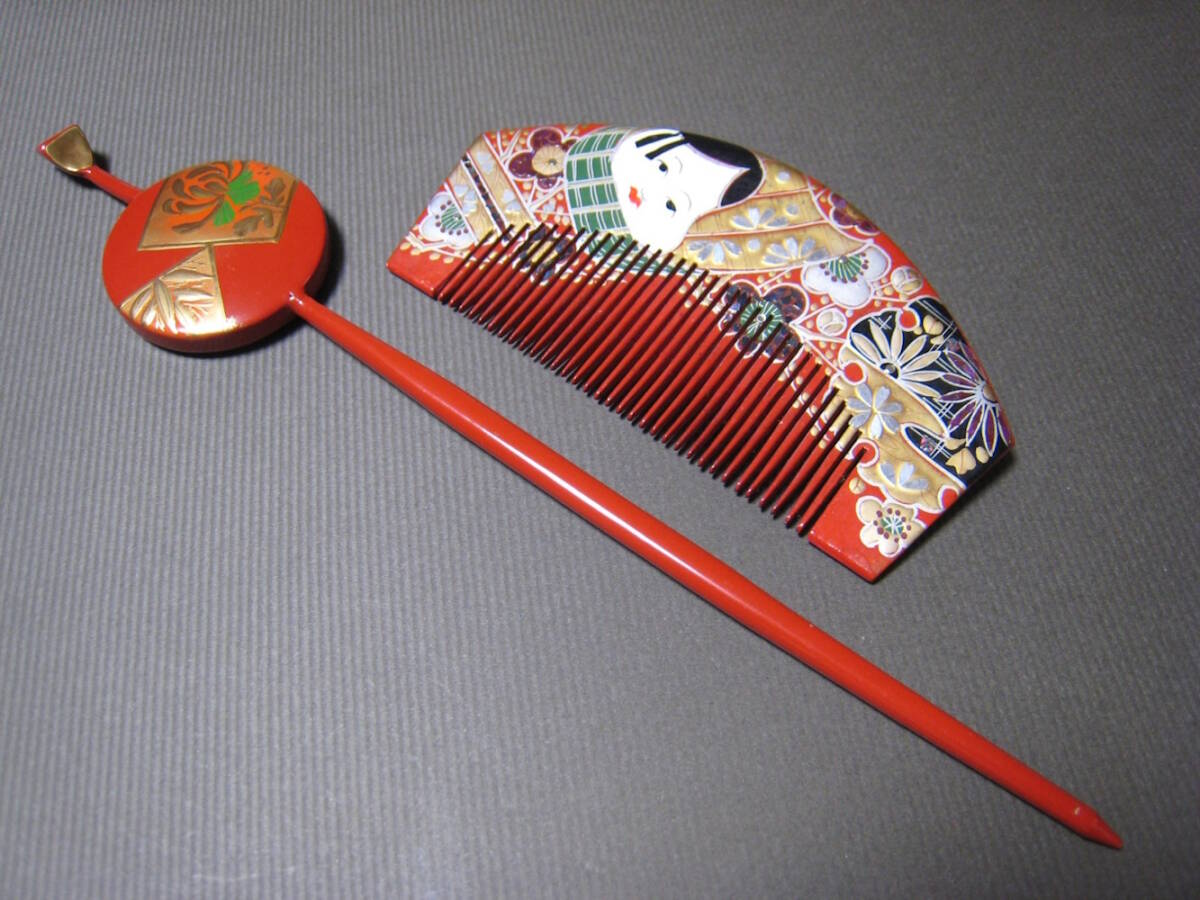 お多福さんと花の蒔絵に螺鈿飾りをあしらった木製朱塗りの可愛い飾り櫛と菊花と笹蒔絵の平簪です。
