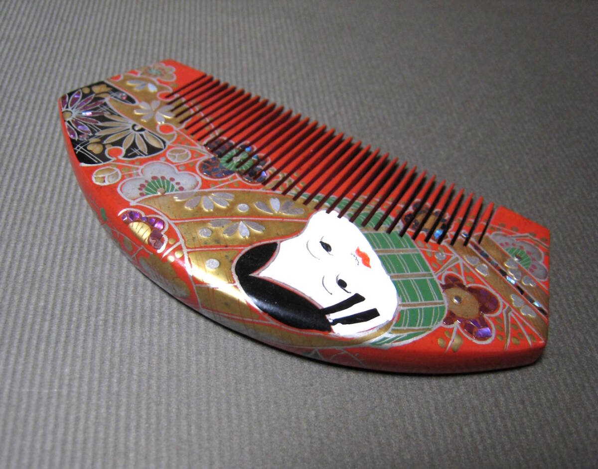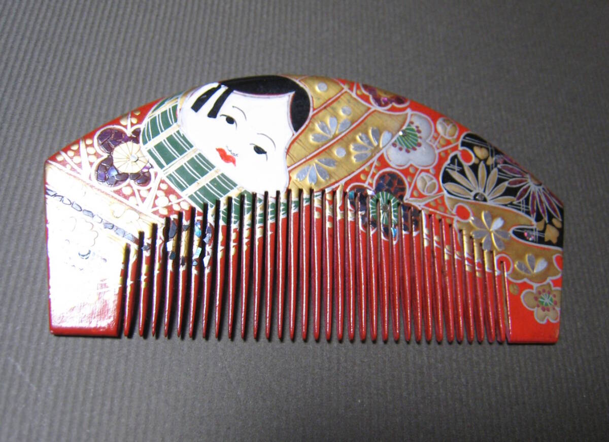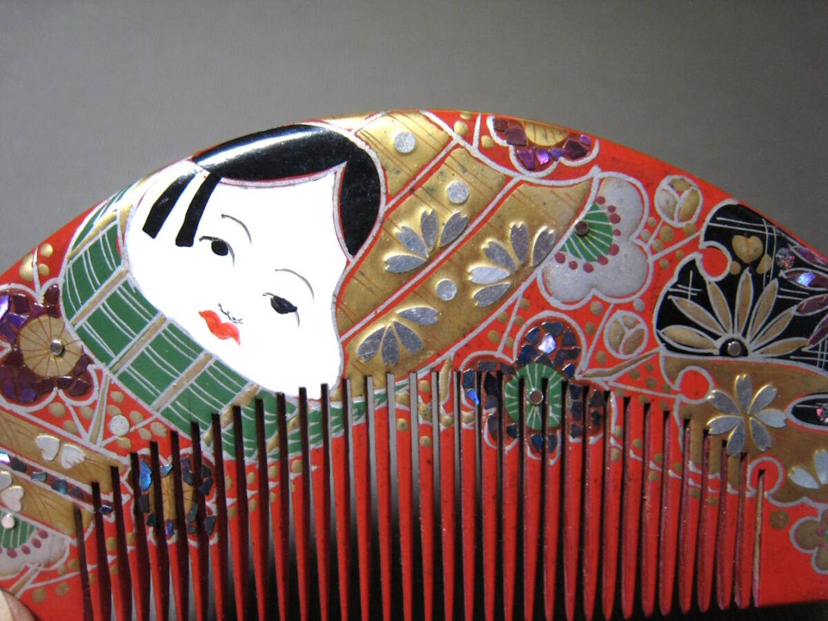 木製 お多福 花 蒔絵 螺鈿飾り 櫛 菊花 笹蒔絵 平簪 日本髪 和装 髪飾り かんざし