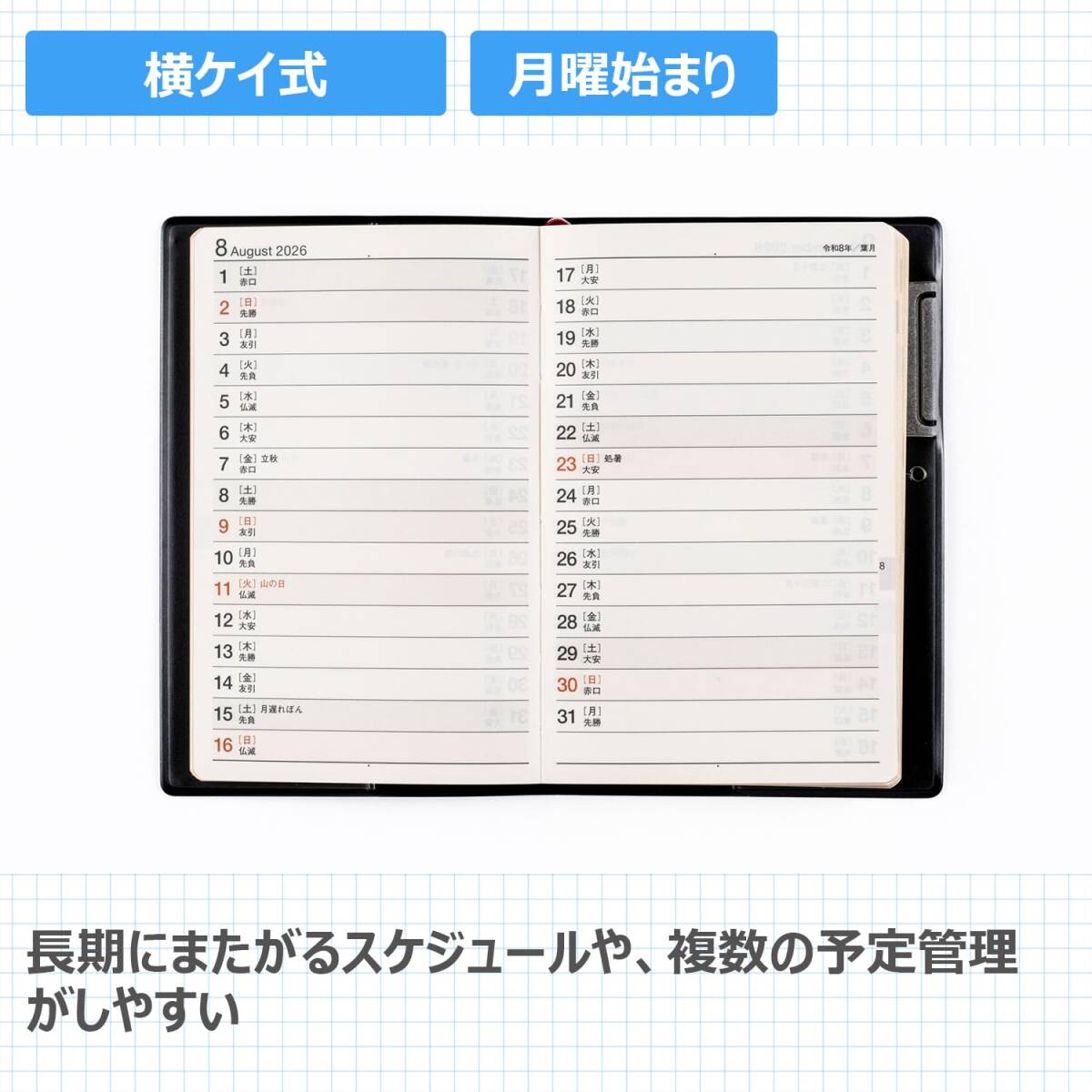 【商品詳細1】サイズ:幅8.5×高さ13cm  【記入欄】●月間ページ…横ケイ式 ●週間ページ…セパレート式 ◇月曜始まり  【掲載期間】月間ページ:2025年12月1日~2027年3月31日 週間ページ:2025年12月1日~2027年1月3日
