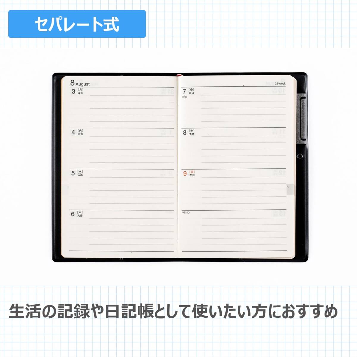 【月間予定欄:横ケイタイプ】長期にまたがるスケジュールや、複数の予定が管理がしやすい横ケイ式。  <BR>【週間予定欄:セパレート式 】1日ごとの記入スペースが大きいセパレート式。日記としても便利に使えます。