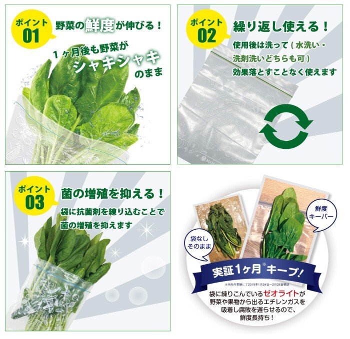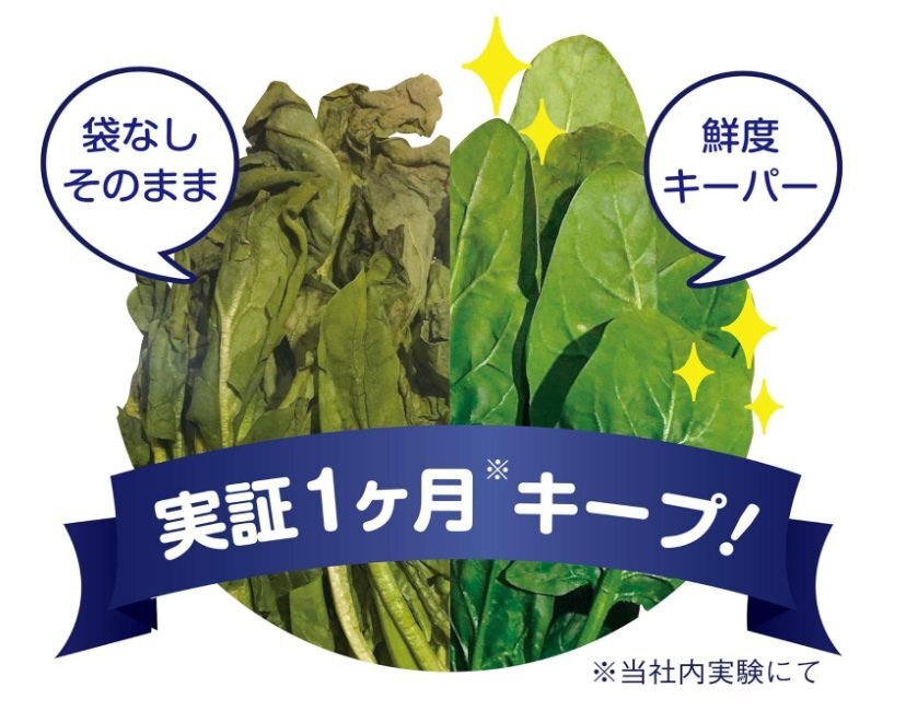野菜の鮮度を1ヶ月キープ Lサイズ:葉もの/大きめ野菜に!(ほうれん草 約1束、キャベツ 約1/2個) |