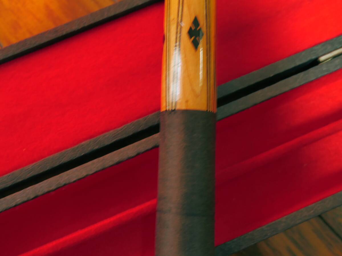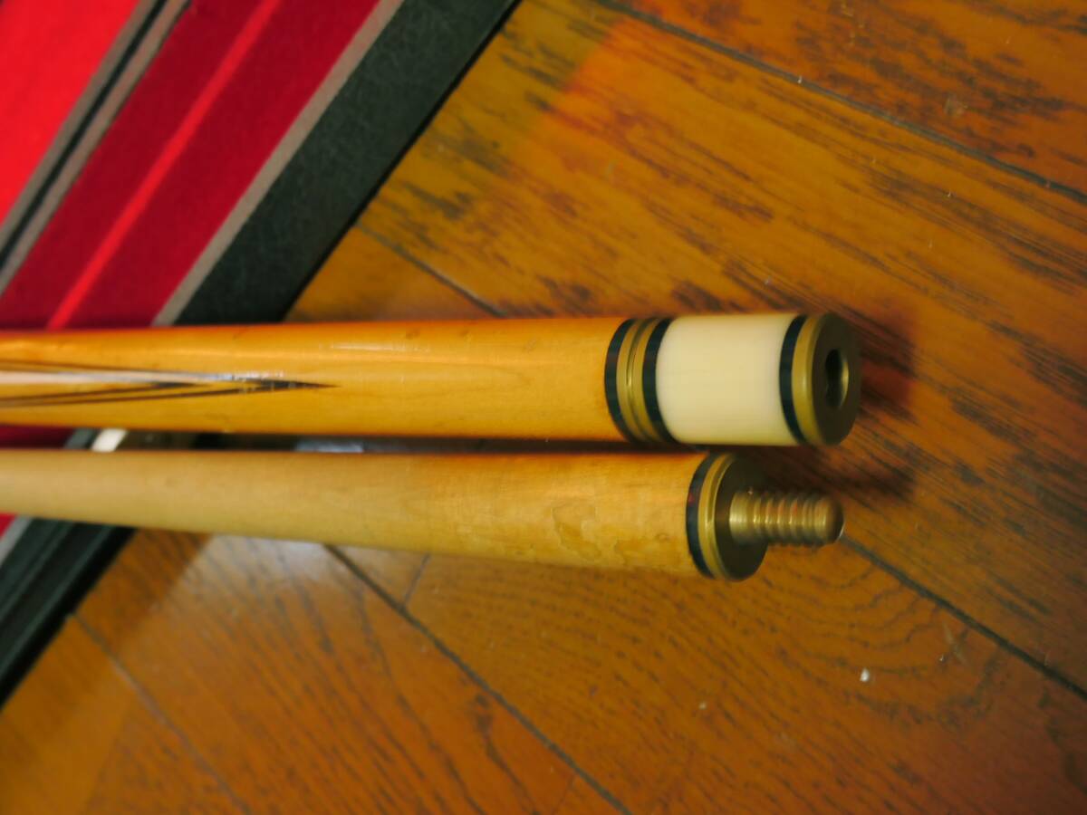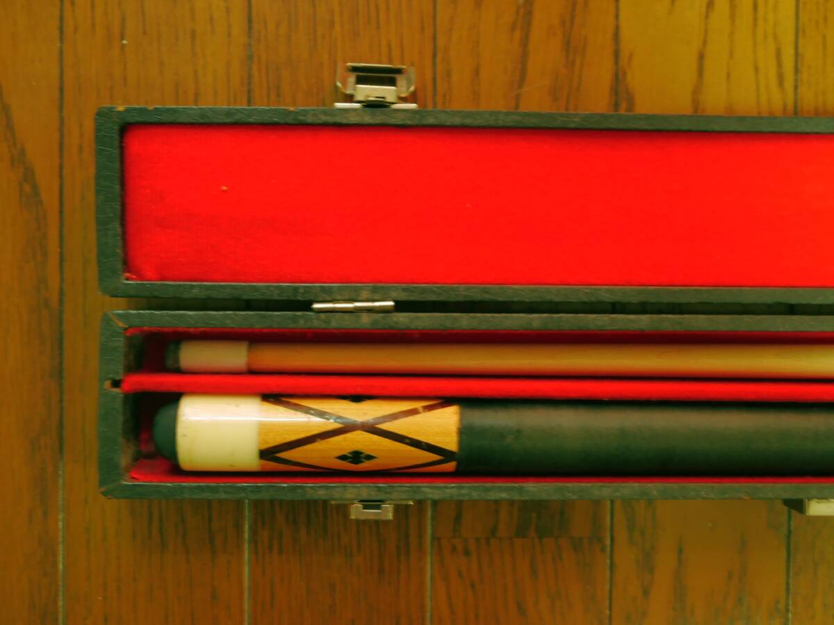 メーカー名や名称、ナンバー等は不明です。また古いわりには綺麗な状態が保たれていると思います。キュー自体の曲がりや反り、割れ等はありません。ジョイント部分もしっかりしています。ハードケースには若干の痛みがあります。