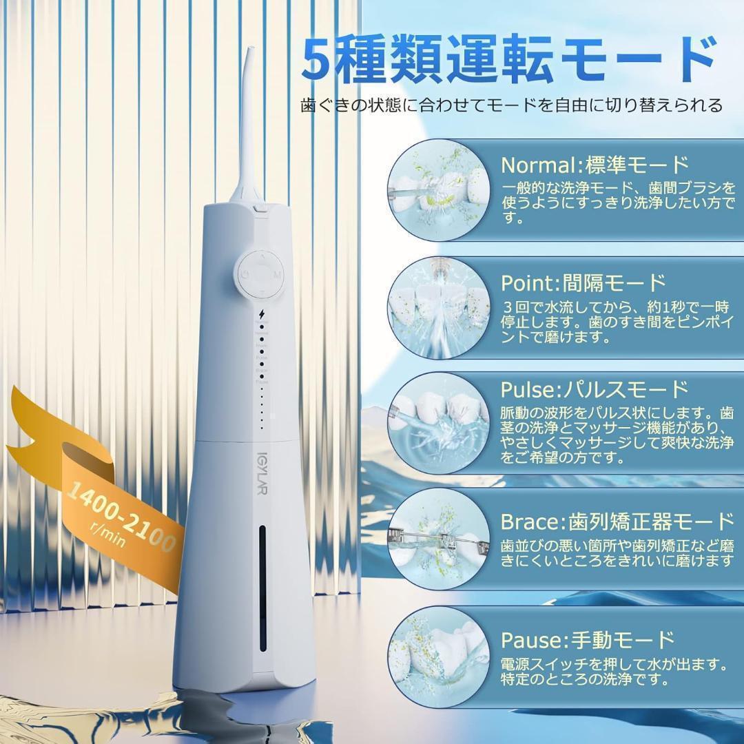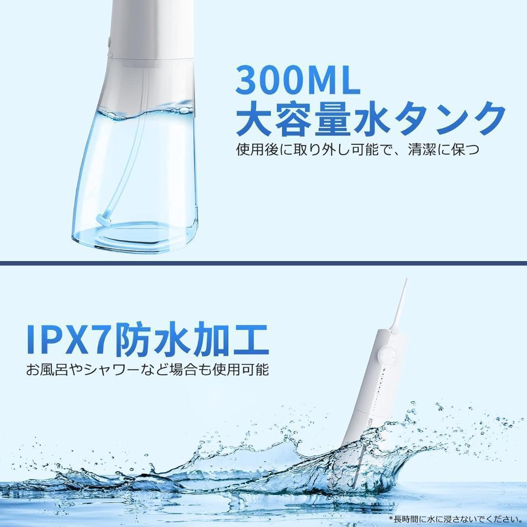 360°回転ノズル4本付きで家族全員で使用可能。ポイント磨きノズルは歯列矯正や磨きにくい場所にも対応。300ml大容量タンクと防水仕様で、お風呂やシャワーでも安心して使用できます。