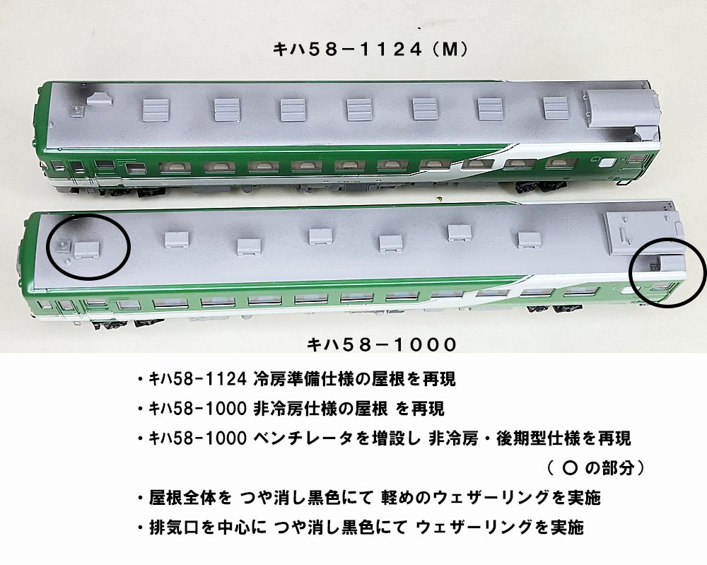 ・キハ58-1000は 屋根上ベンチレータが増設された姿 を再現