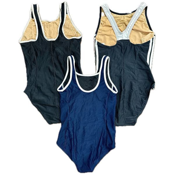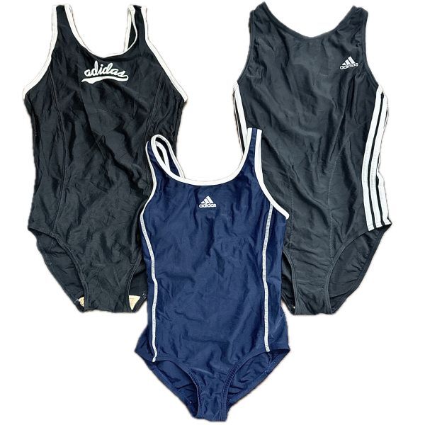 36【3枚セット】アディダスadidas女子水着160(Lサイズ程度)★光沢ブラック黒ネイビー濃紺ホワイト白パイピング★大きいサイズ男性も
