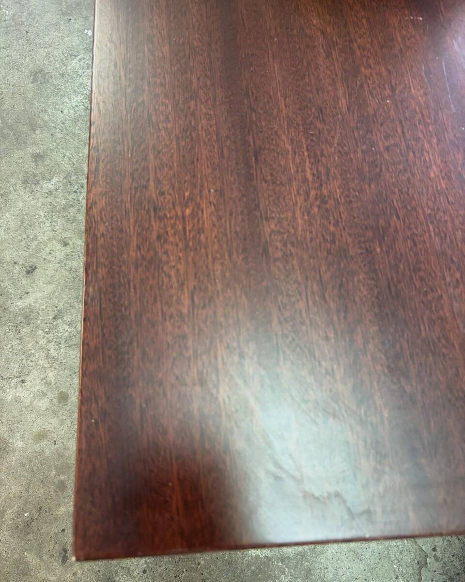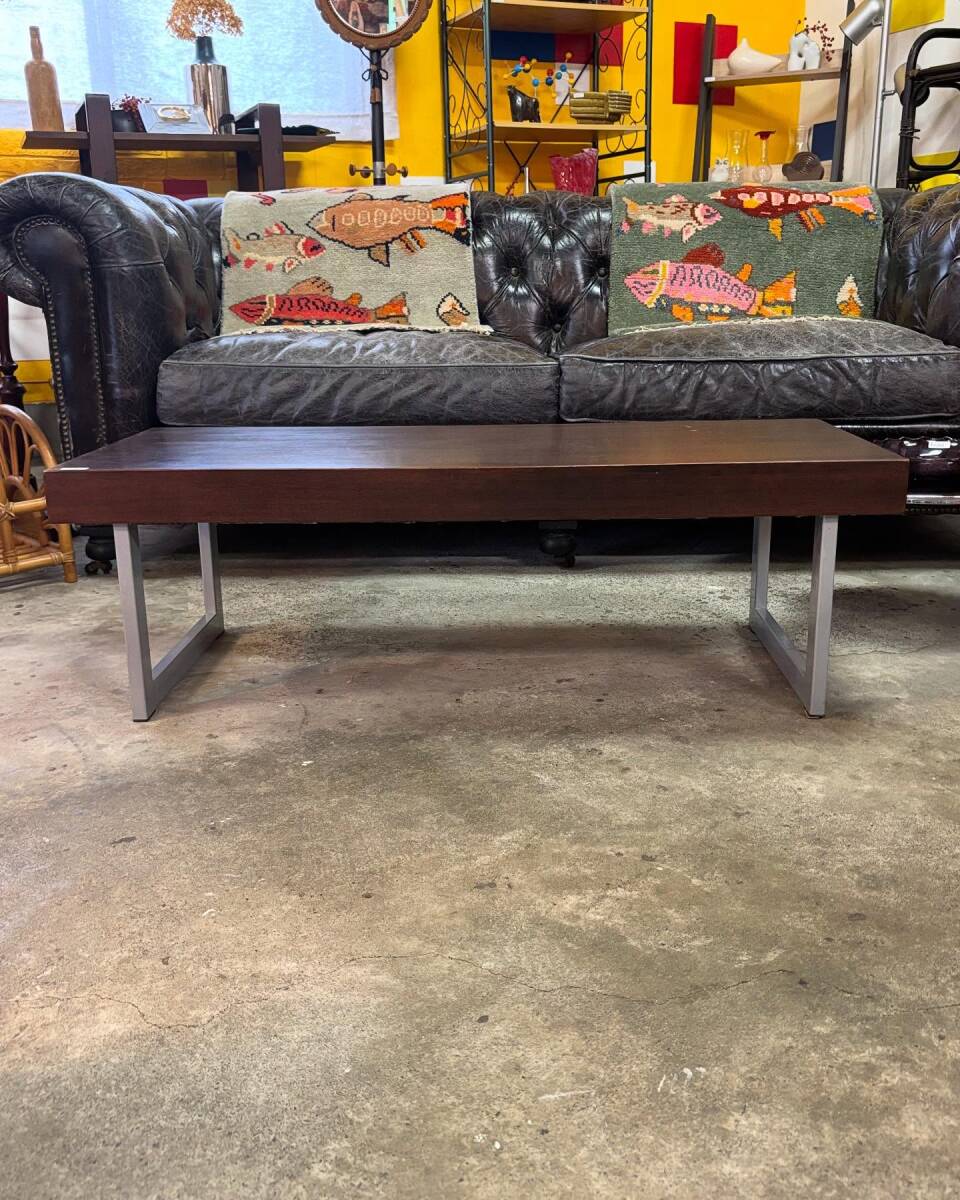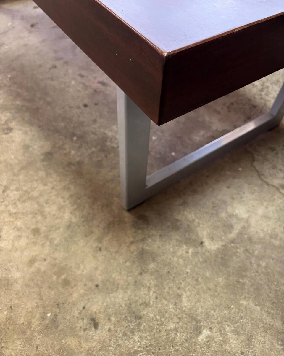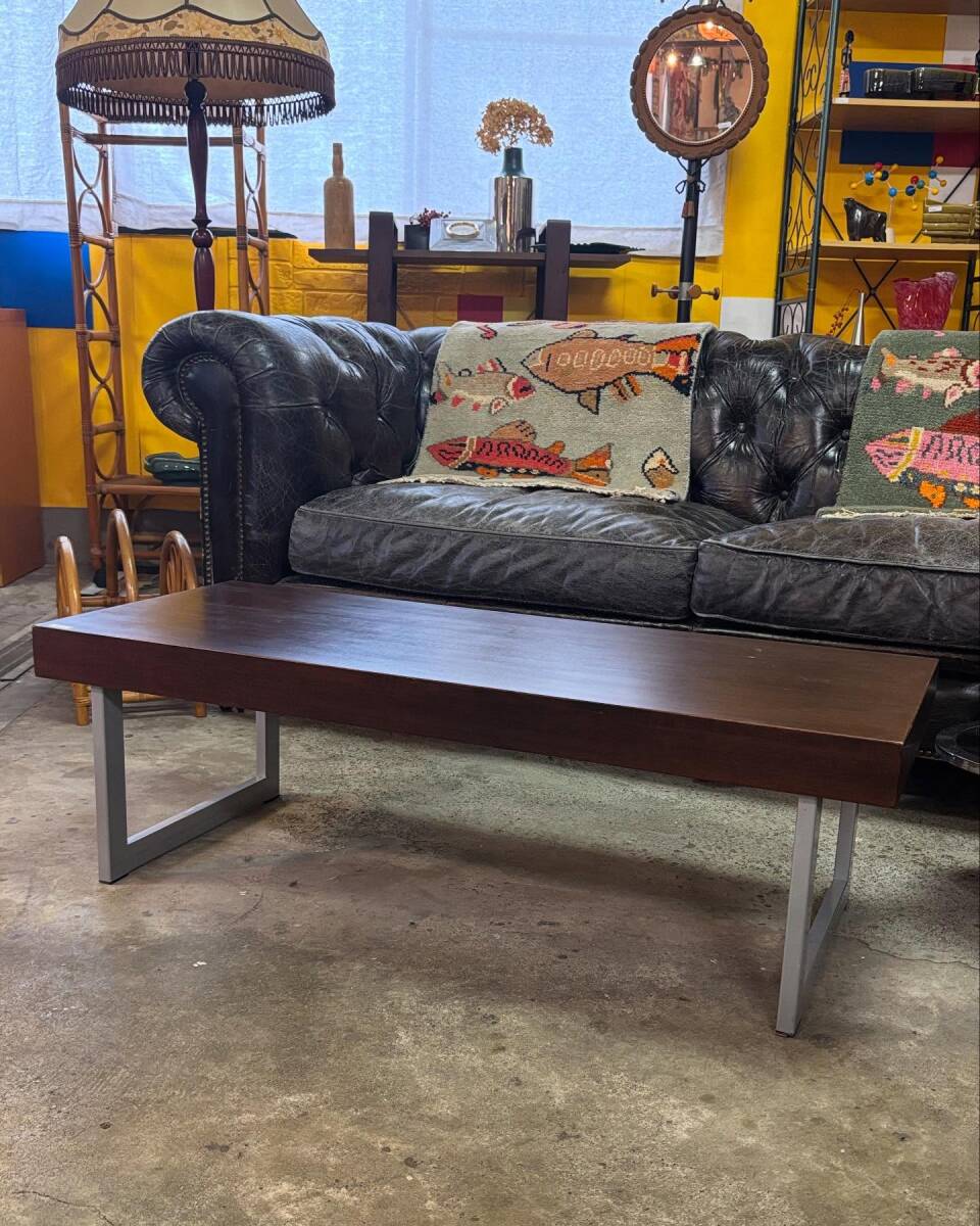 無駄のない直線美が際立つモダンなローテーブル。深みのある木天板とクールなメタル脚の組み合わせが、空間に洗練された印象をプラス。ヴィンテージからミッドセンチュリー、現代インテリアまで幅広くマッチします(天板に小傷有り)