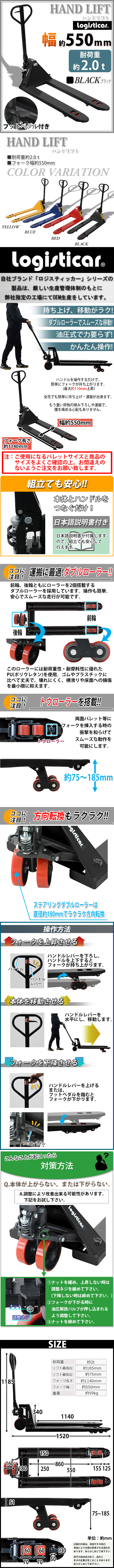 | 商品名 | 送料無料 ハンドリフト 幅約550mm フォーク長さ約1140mm 約2t 約2.0t 約2000kg 黒 油圧式 ダブルローラー ハンドパレット ハンドパレットトラック ハンドリフター パレットトラック ブラック handyp3dw550bk20 |