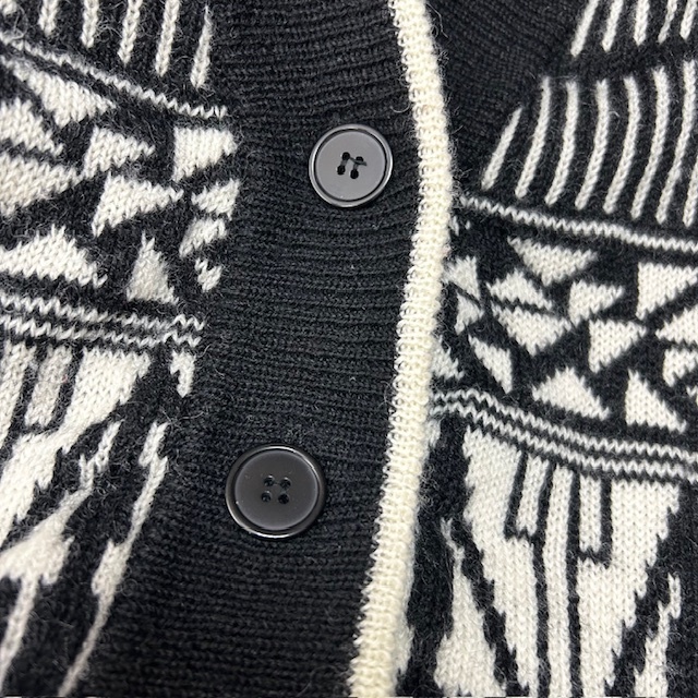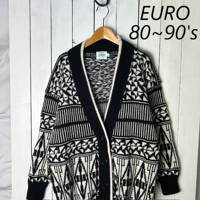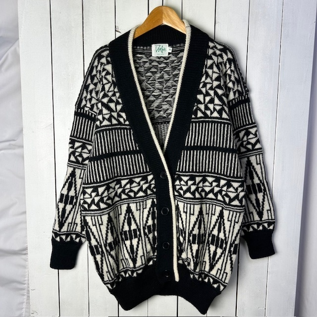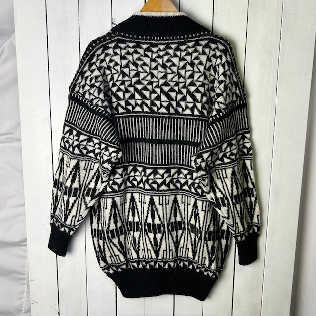 ヨーロッパ 80s~90s モノトーン幾何学模様 ウールニットカーディガン 白黒 大きめ M ヴィンテージ ユーロ L~XL ジャガードニット●302