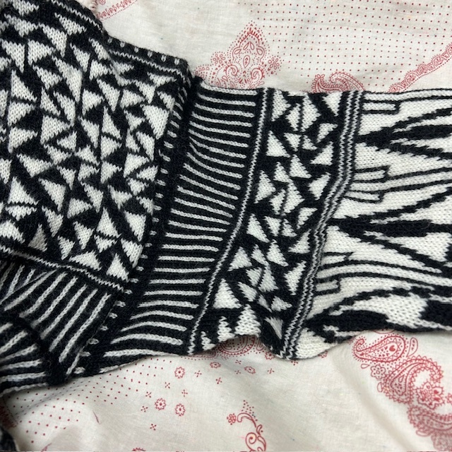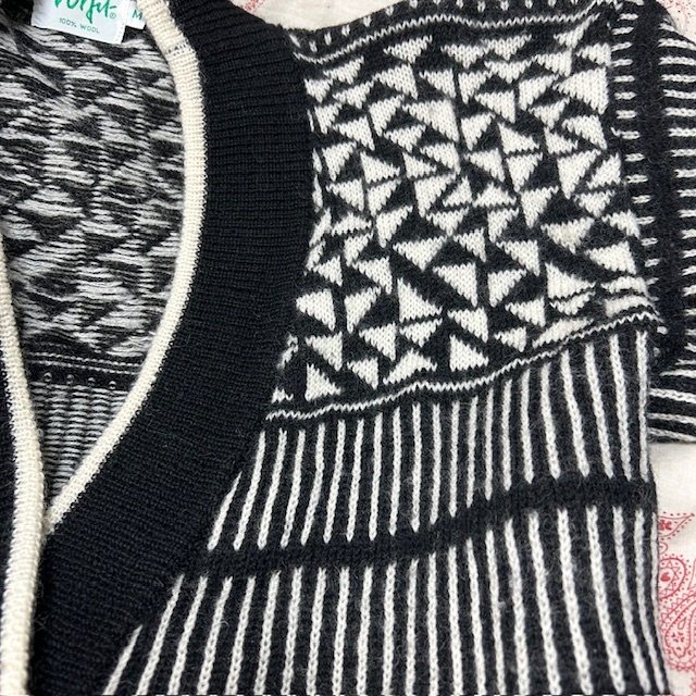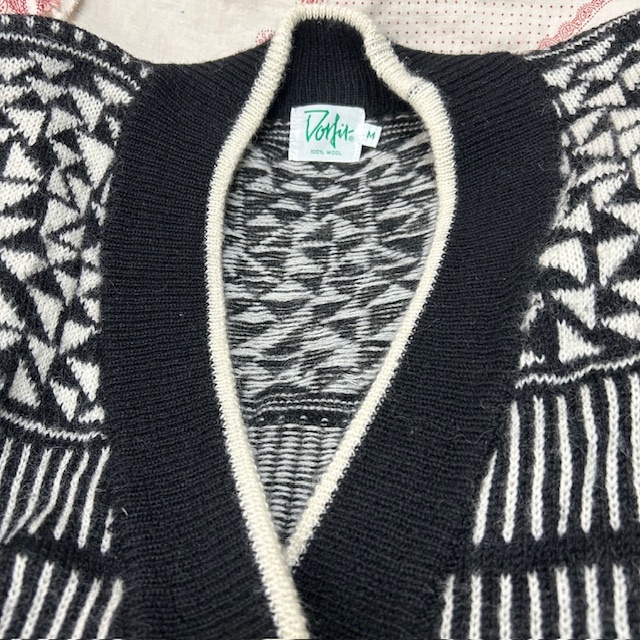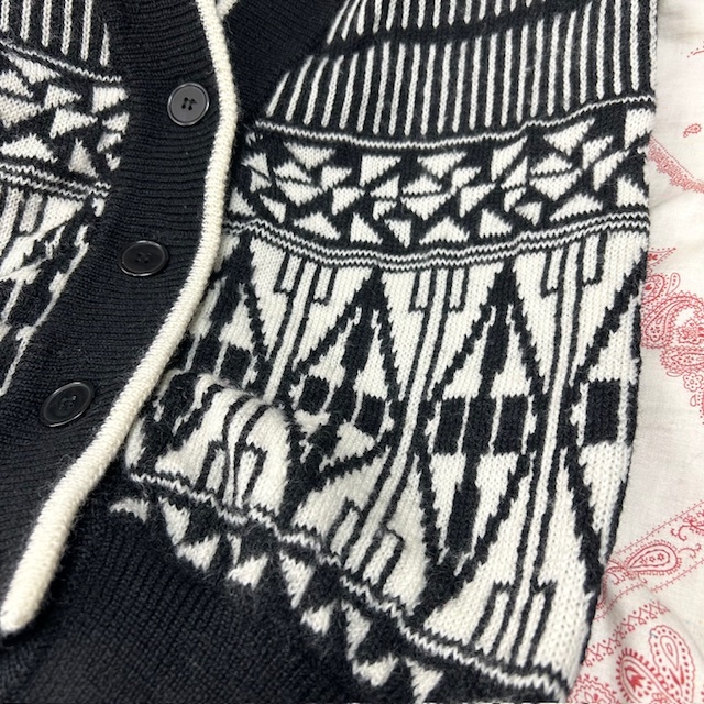 ●商品説明・・・ヨーロッパ古着になります。80年代~90年代頃と思われるオールド・ヴィンテージのモノトーンの幾何学模様のようなジャガード編みの柄ウールニットカーディガンです。オールド物の肩のラインの落ちるゆったりしたシルエット感です。素材はウール100%で、ミドルゲージ程度のざっくり厚手なニットカーディガンです。色は黒×白です。サイズ表記はMですが、ゆったり大きめな作りで、L~XL程度のサイズ感で、レディース合わせですが、メンズの方も着ていただけるサイズ感かと思います。