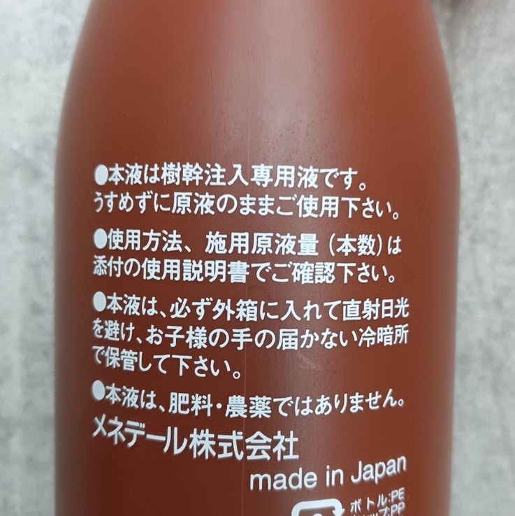 | 移植によるアクシデント、環境の変化などで衰弱した樹木に生きる力を与える樹幹注入液です。 幹に直接注入するため、樹木の組織にダイレクトに作用。確実な効果が期待できます。 直物に必要な二価鉄イオンが主成分なので、続けて使用しても薬害の心配がありません。 |
