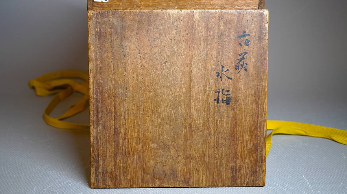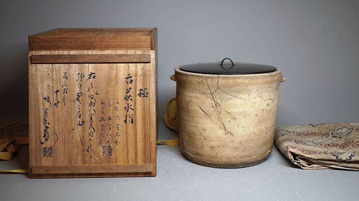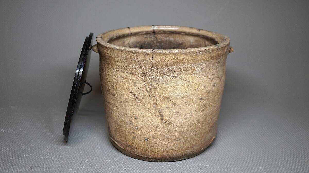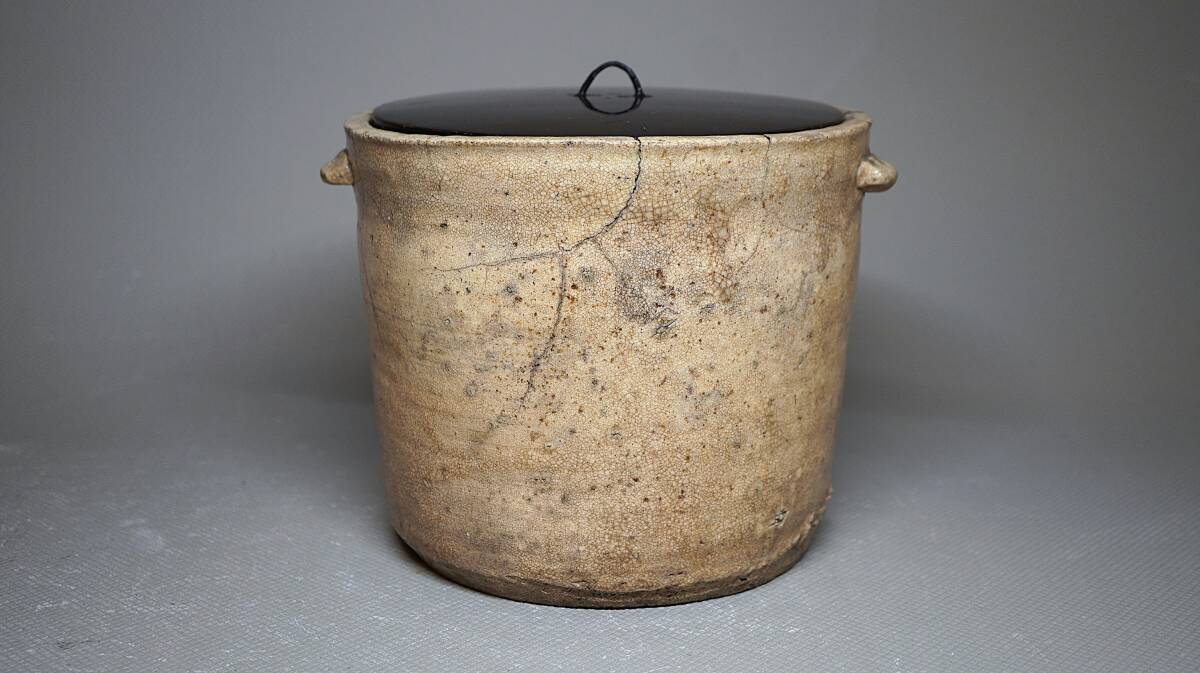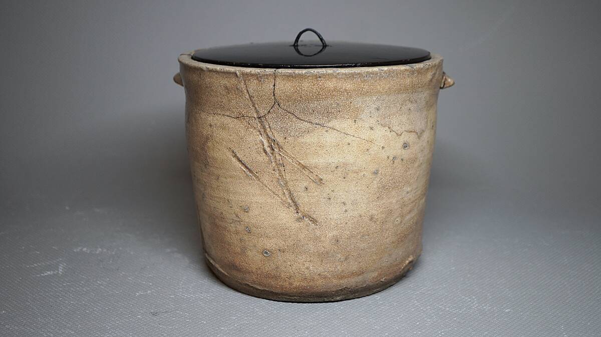 伝世された大振りで素朴な形の水指で、全体が枇杷色になり所々雨漏りが表れるなど古格に満ちた水指です。