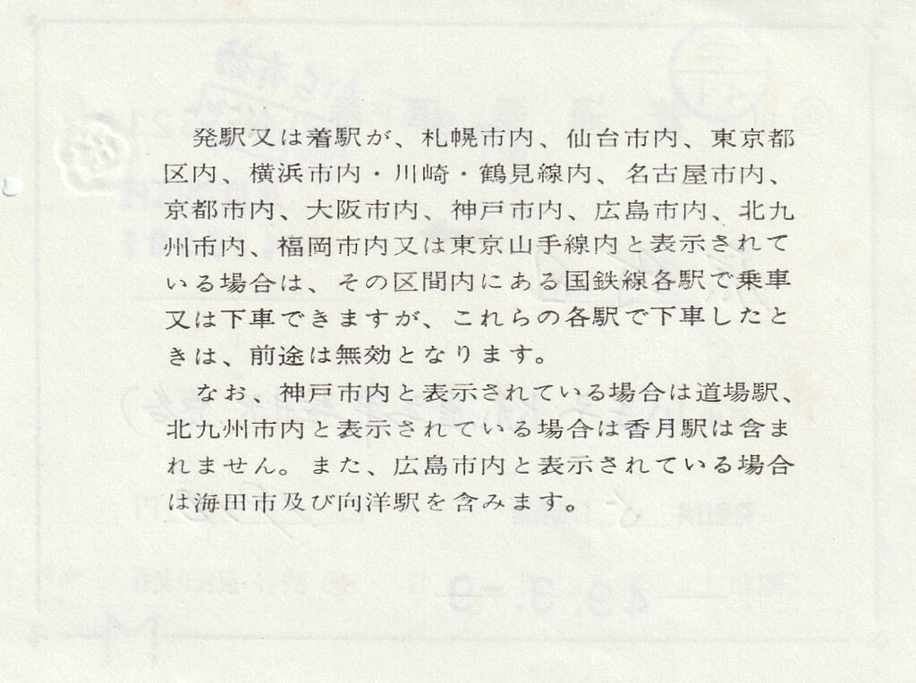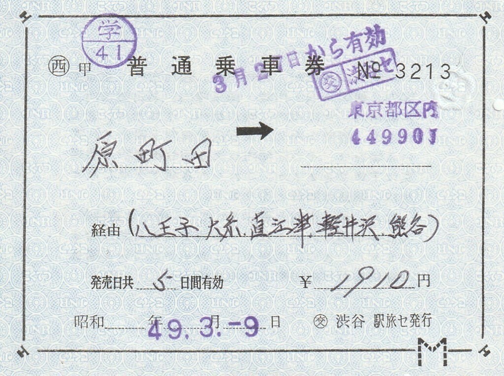 M040.【普通乗車券】原町田⇒東京都区内 八王子・大糸・直江津・軽井沢・熊谷経由 49.3.9【3213】〇交 渋谷駅旅行センター発行