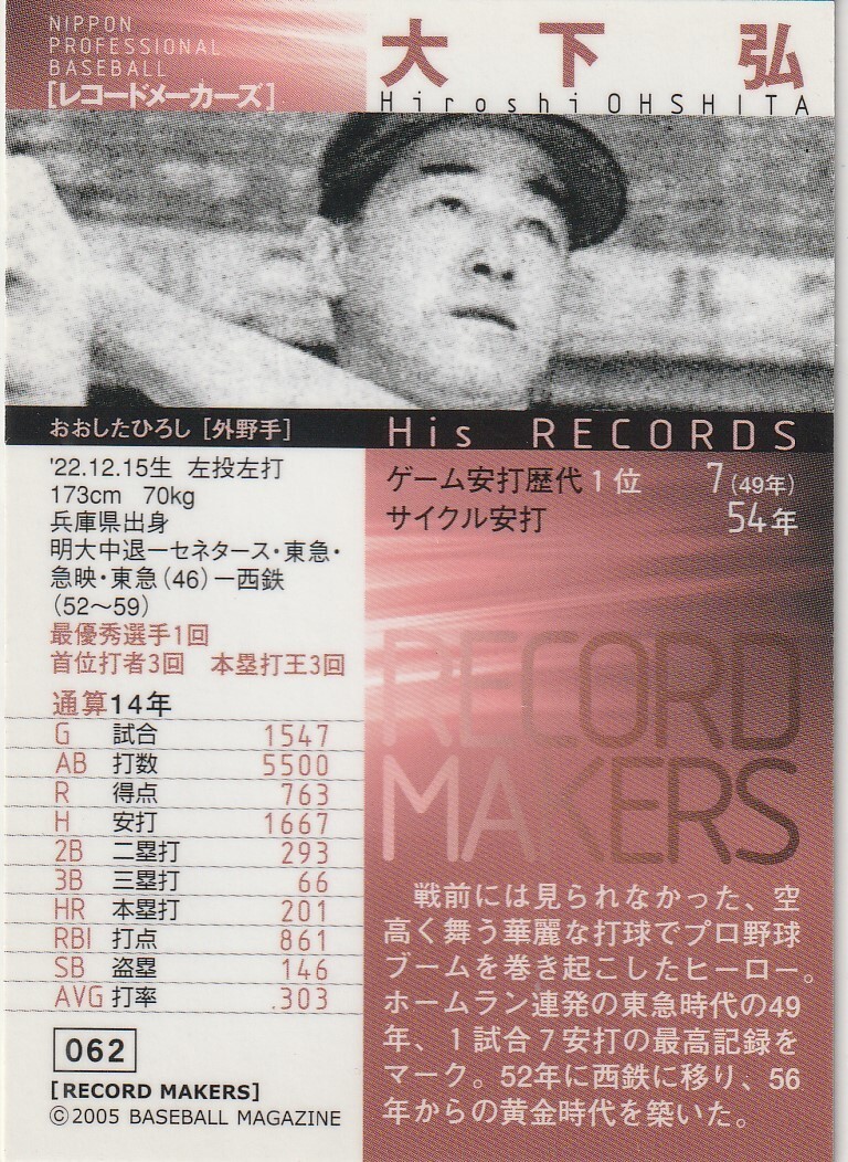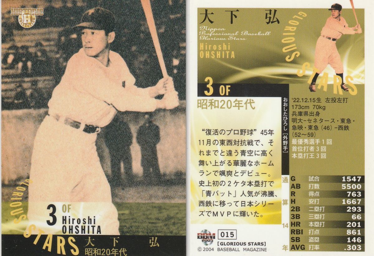 ●2004BBM/きらめくスターたち【大下 弘】 OB選手 No.015,2005レコードメーカーズ No.062:西鉄