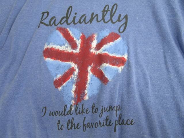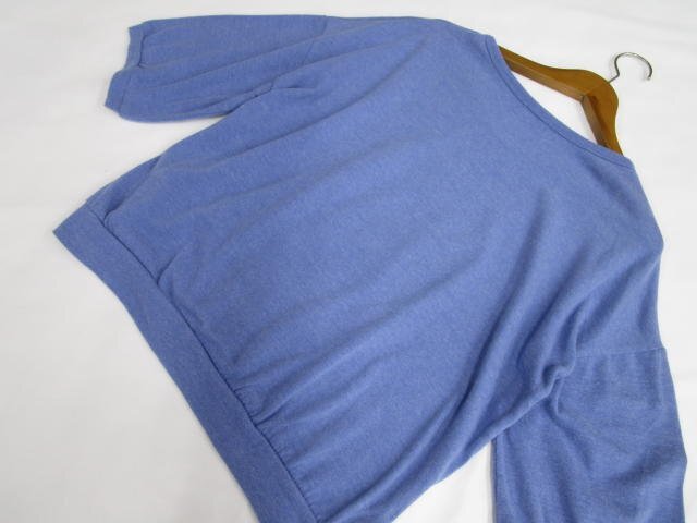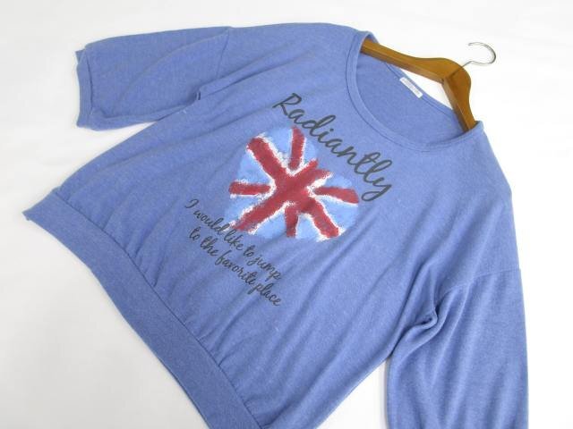 パフスリーブ ドロップショルダー 七分袖 ラウンドネック カットソー M ブルー地 レッド×ブルー×ホワイト ハート柄&ブラック 英字 【メール便可】