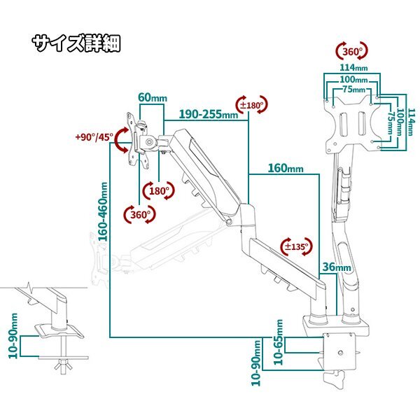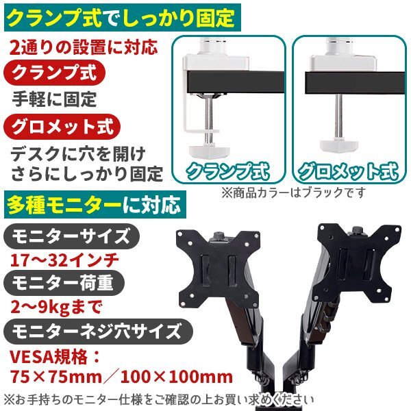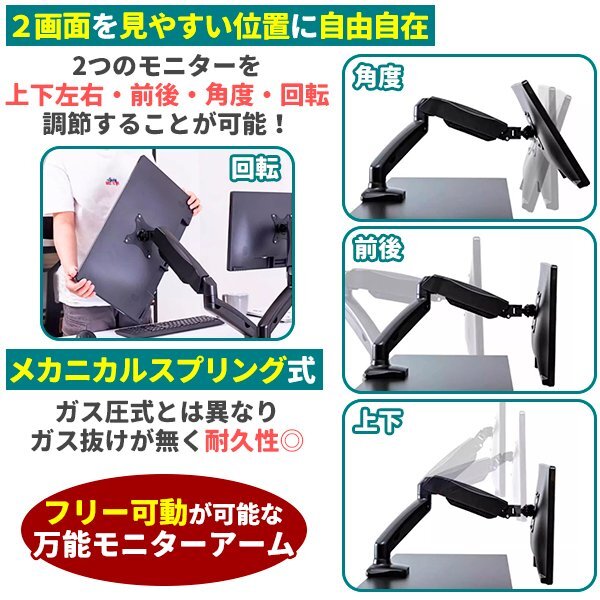 モニターアーム 2画面 32インチ まで対応 VESA 対応 デュアル デュアルディスプレイ クランプ スプリング 式 メカニカルスプリング