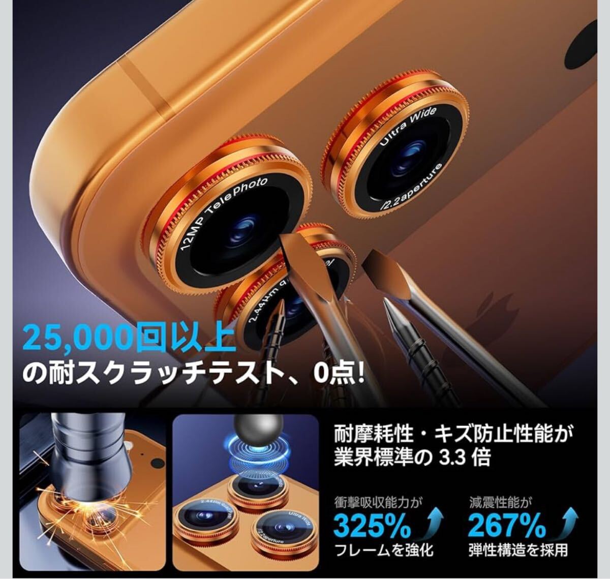 【軍用グレードのカメラレンズプロテクターで、過酷な冒険をサポート】X-it for iPhone 17 Pro/Pro Maxカメラ保護フィルムは、強化チタン合金のエッジと12KGの強固な圧着加工により、軍用グレードの耐落下性と耐衝撃性を備えています。ハイキング、スキー、ビーチでの使用に最適です。iPhoneのカメラレンズを砂や岩、不意の落下から守ります。