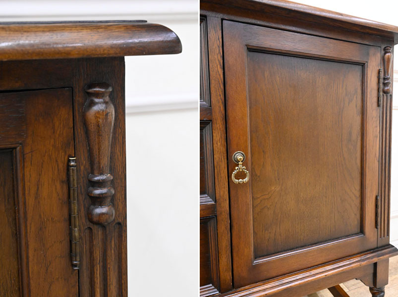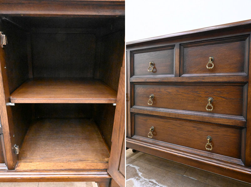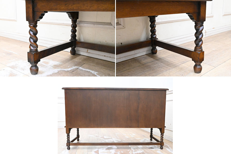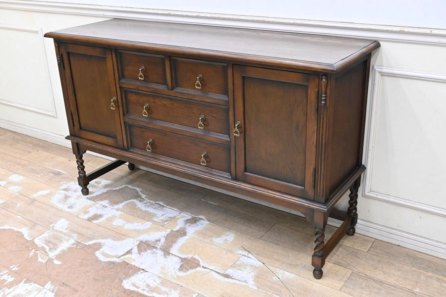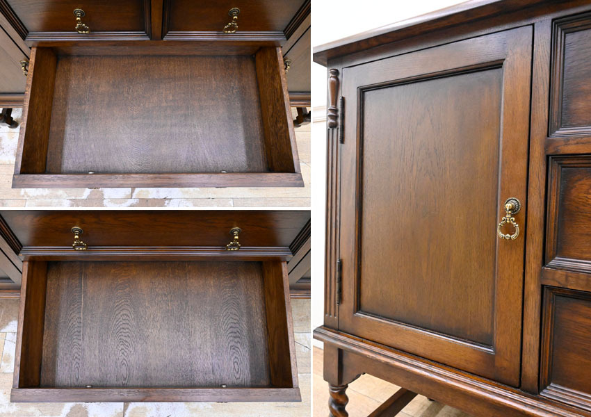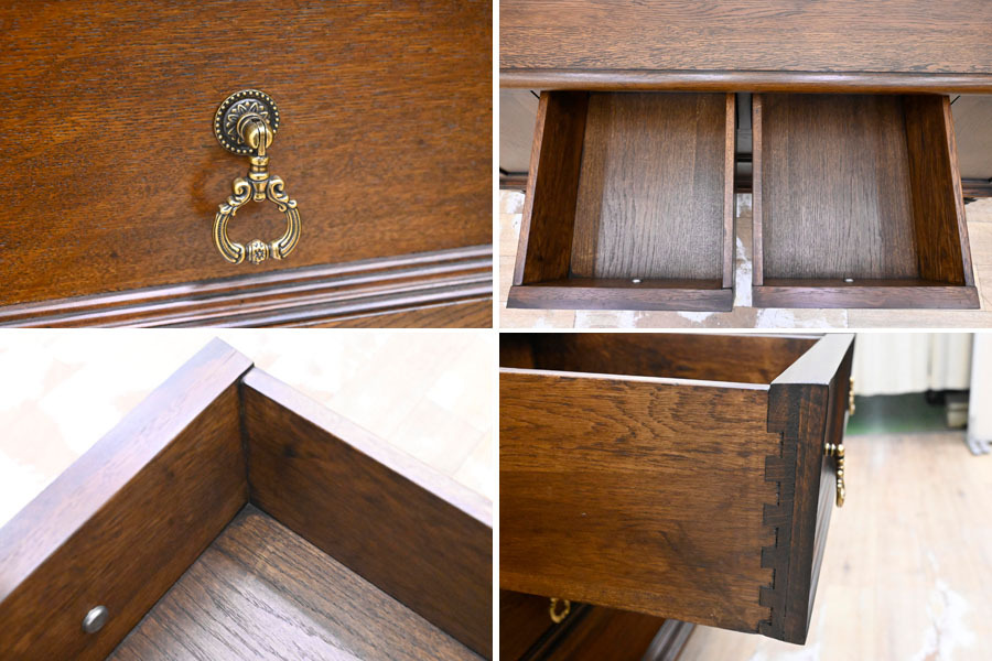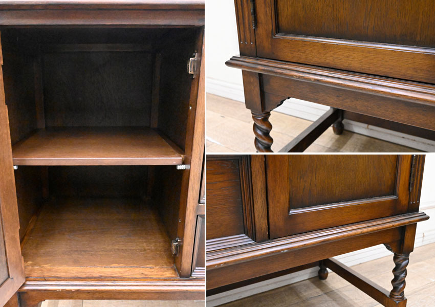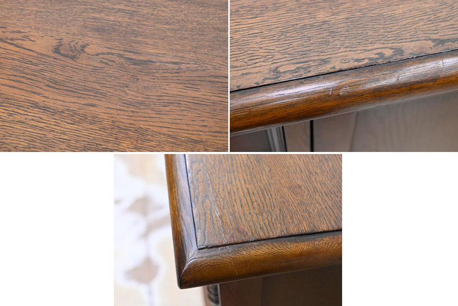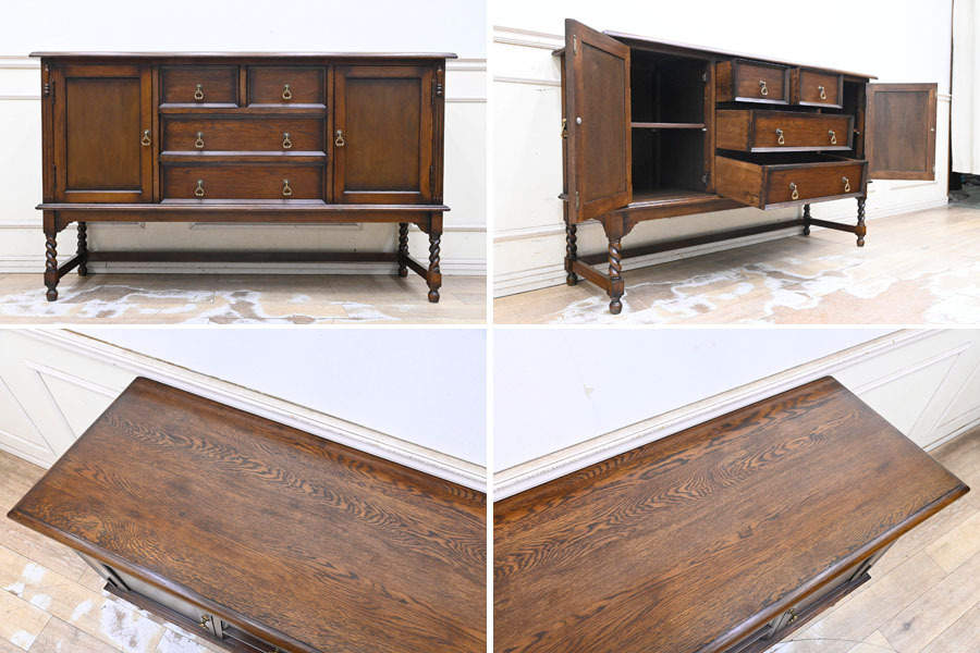 ----------------------------------------------------------------------------------------- ●送料や注意事項は必ずご確認下さい。落札後にトラブルになるケースが増えております。● ◆コンディションは写真・文章にて記載して有りますが、全てのキズの写真は掲載致しておりません。大きなダメージを除き見落とし、記載漏れが有る事はご了承下さい。 ◆当サイトにて出品する商品は多種多彩で、当方商品知識の無い物も多数ありますので落札後の質問やメンテナンス等にはお答えできません。 ◆入札された時点で、画像、文章をご理解していただいたものと判断させていただきます。不明な点は前もってQ&Aからお願い致します。入札後の質問やお電話等でのキャンセルは一切受け付け致しません。 ◆商品説明に「ノークレーム」と記載しているものに関しては、如何なる状況で届いても保証致しません。詳しくは注意事項の「商品到着後について」の最後に記載しておりますのでご確認下さい。 ---------------------------------------------------------------------------------------- 英国調の素晴らしいサイドボード、中古品の出品です。 オーク材の美しい木目と重厚感は安物家具で使用されることは有りません。 しかも各部を丁寧に作り込むことで、英国アンティーク感を漂わせています。 幅150 奥45.5 高90.5cm 【コンディション】 多少の小キズ、スレ、ガリキズ、天板向かって右前角ヒビ、内部保管臭?、背板にヒビ等有りますが、程度は良いでしょう。 | ||