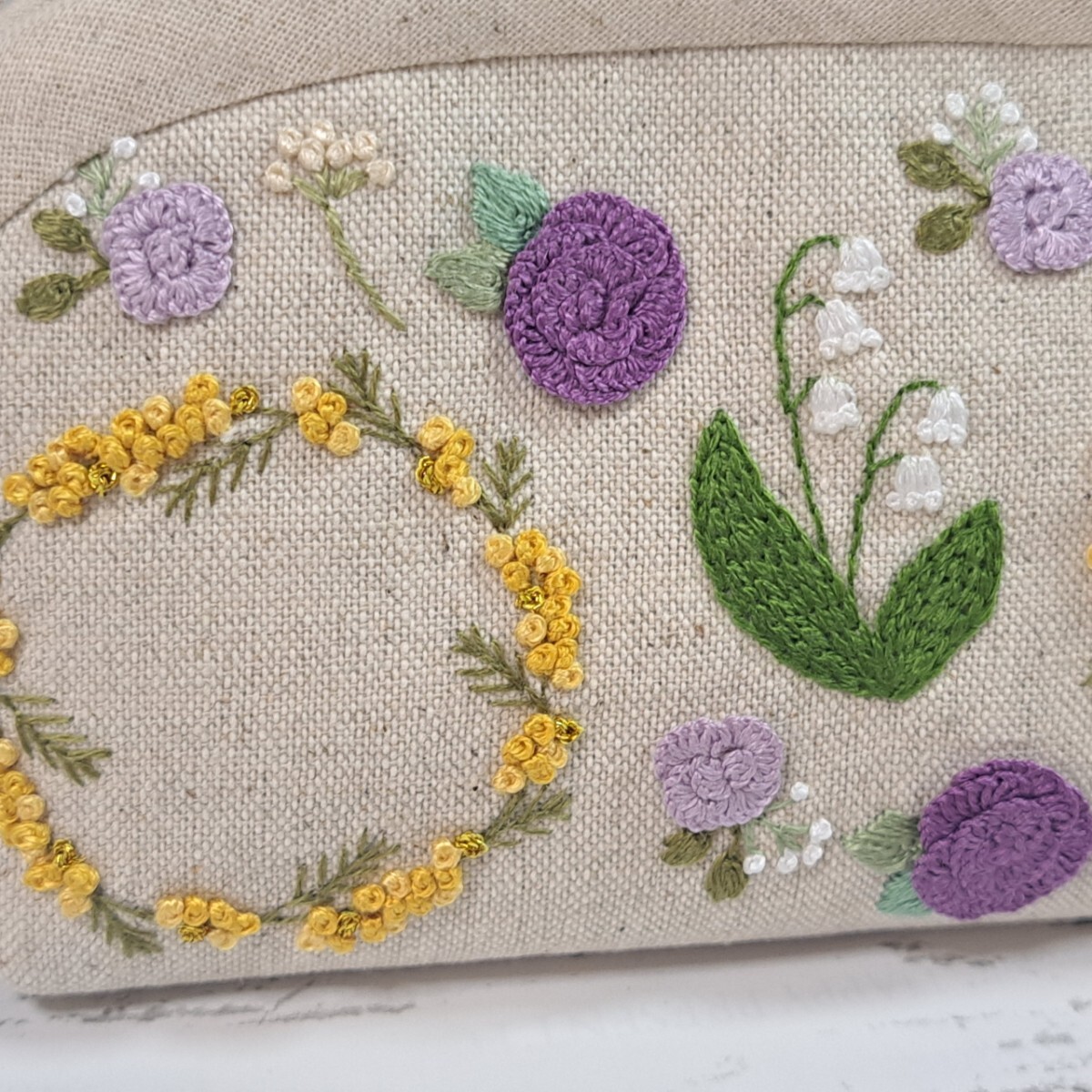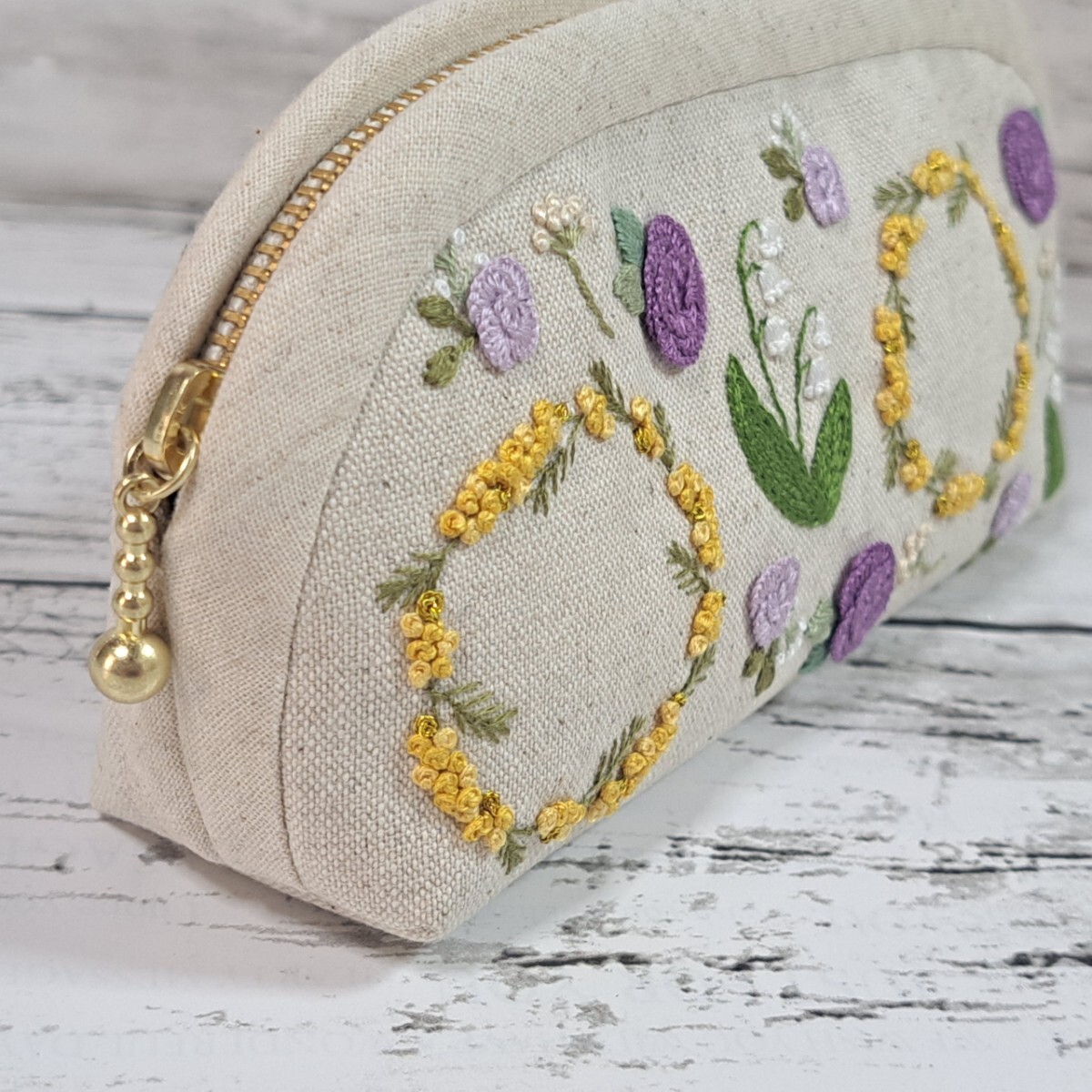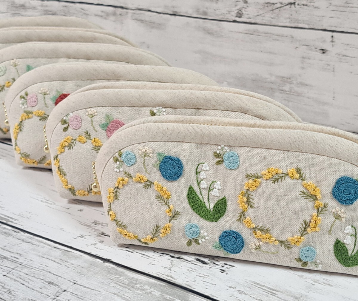 バラとスズラン ミモザの手刺繍入り、メガネケース、ペンケースの出品です。