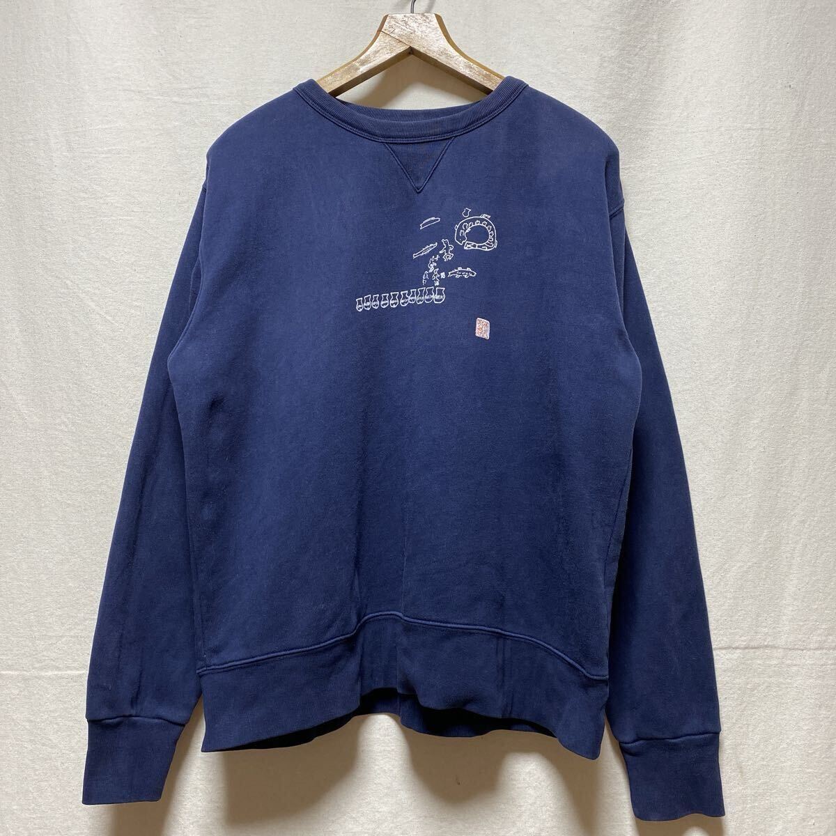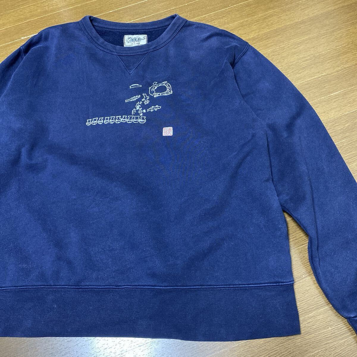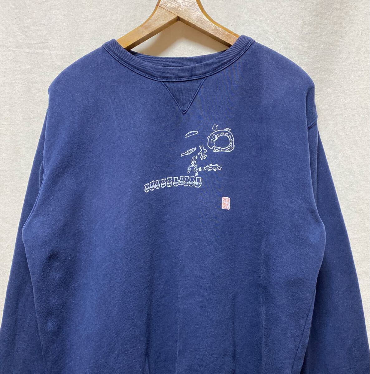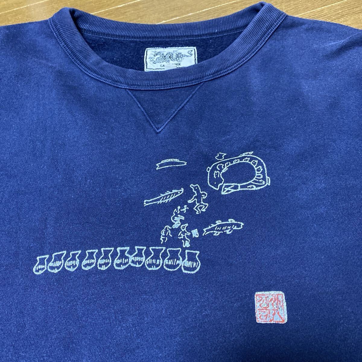 前Vのヴィンテージ調なスウェットに和柄のようなユニークなプリントが派手過ぎない良い塩梅です