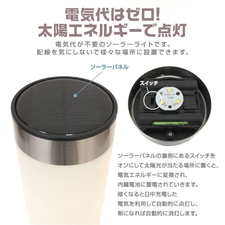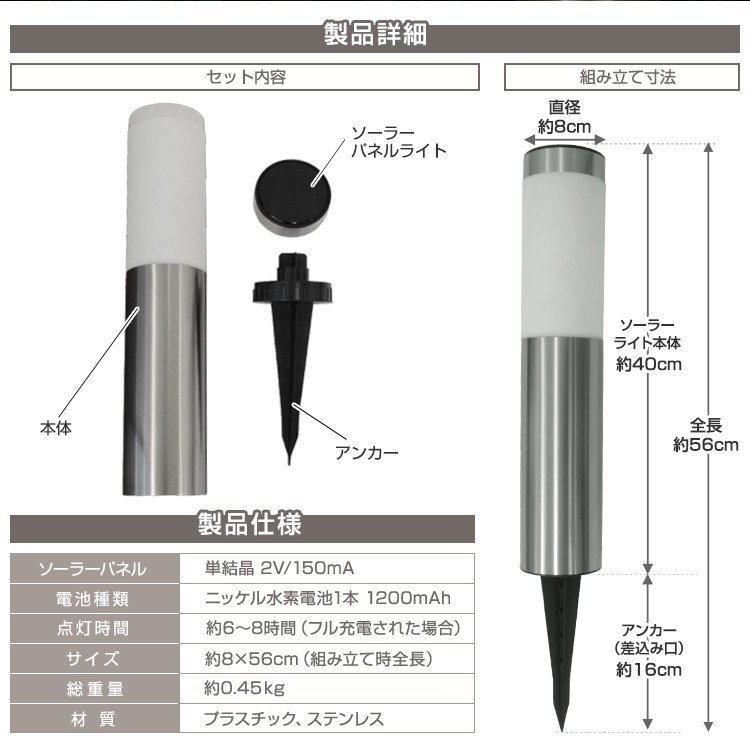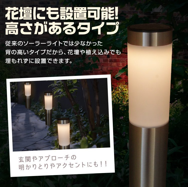 | 地面に埋め込むだけで設置でき、ソーラー発電で電気代不要! お庭や玄関先などに最適なLEDソーラーライトです。 地面に差すだけとセッティングもカンタン。 暗くなったら自動点灯、明るくなったら自動消灯。 ソーラーパネルが日中太陽の光で充電し、夕暮れになると自動的に点灯します。 お手軽カンタンに、自宅のお庭を彩ります。 付属品のアンカーを地中に埋め込んで固定し、玄関までの通路や庭先までのアプローチ部分にやさしい明かりを灯して下さい。 ●詳細 サイズ ・直径:(約)8cm ・ソーラーライト本体:(約)40cm ・全高:(約)56cm 重量:(約)450g 発光色:電球色 光源:LED 電池:電池:ニッケル水素電池1本 1200mAh 点灯時間:(約)6~8時間 ※直射日光が6時間以上あたる場所に設置した場合。 素材:プラスチック、ステンレス ●セット内容 ・本体 ×1 ・ソーラーパネルライト ×1 ・アンカー ×1 (ガーデンライト ソーラー おしゃれ ソーラーガーデンライト ソーラーライト ガーデン 防犯 車 照明 外灯 LED照明 LED 庭園灯 スポットライト 門灯 自動点灯 ソーラーLED 庭 ガーデニング プレゼント 安い 人気 おすすめ ) |