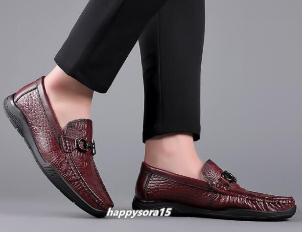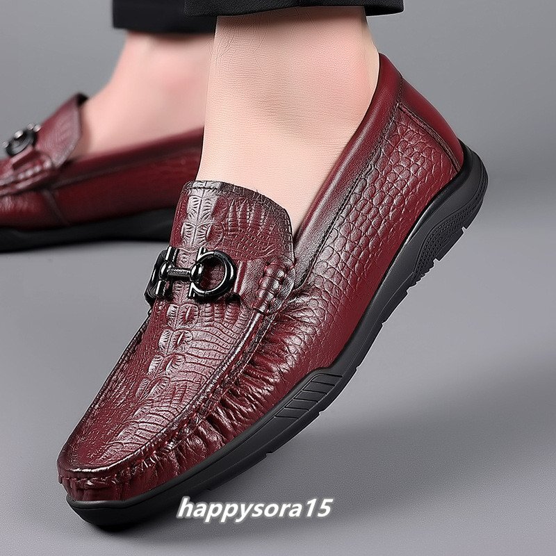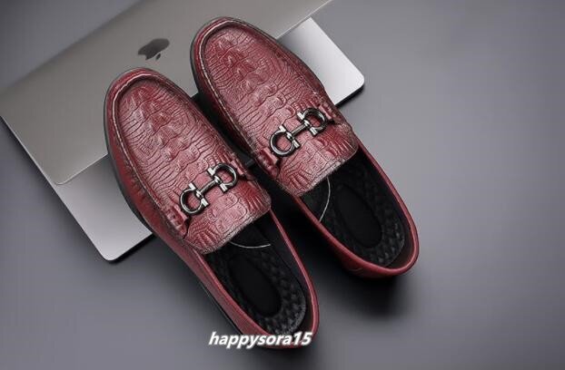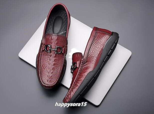 ローファー メンズ スリッポン ビジネスシューズ 本革 牛革 ローカット カジュアル メタル ワニ柄 クロコダイル レッド 27cm