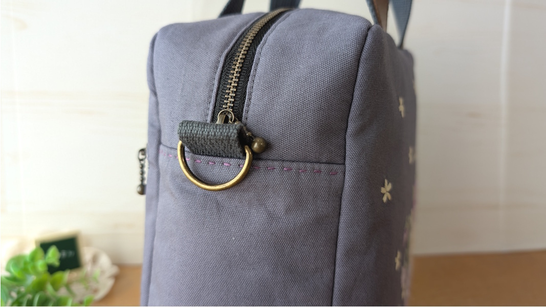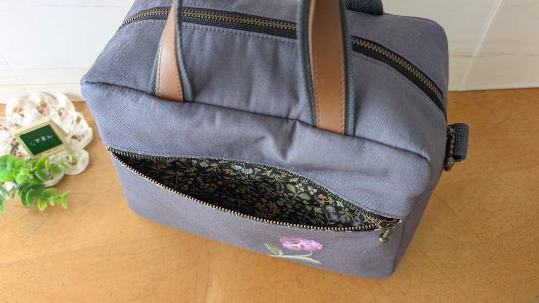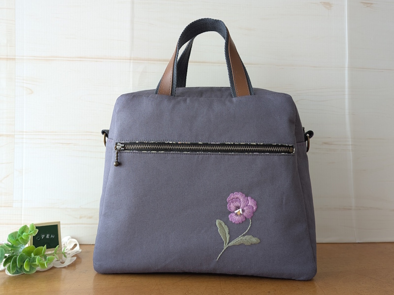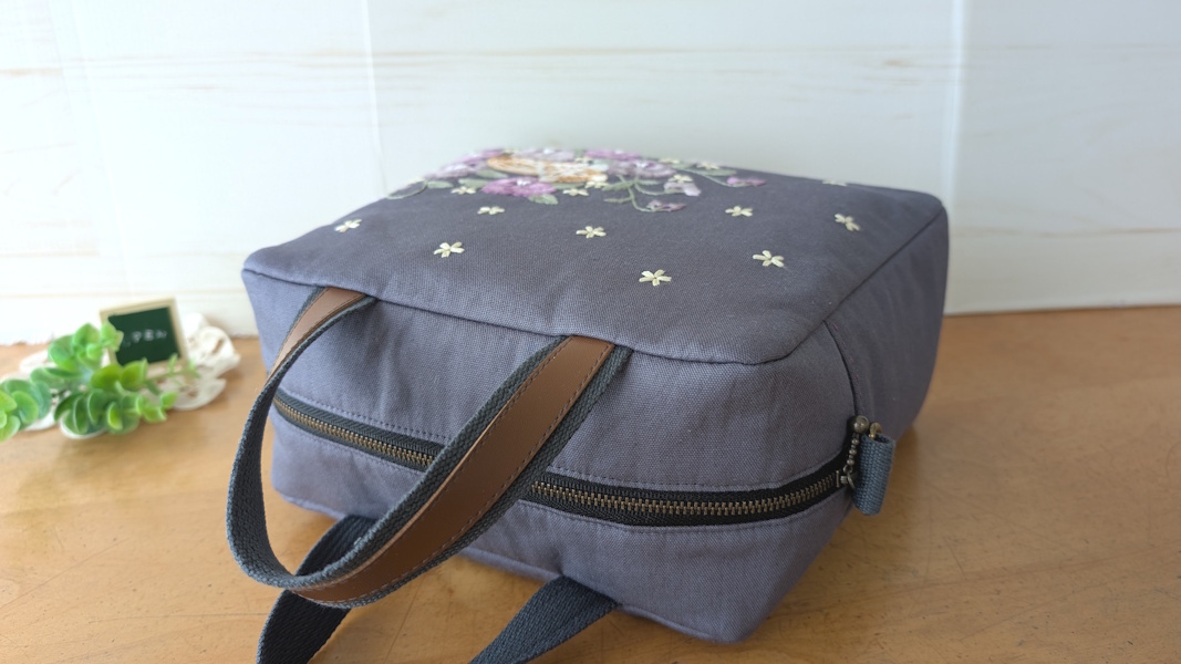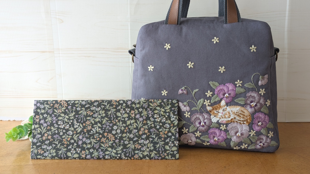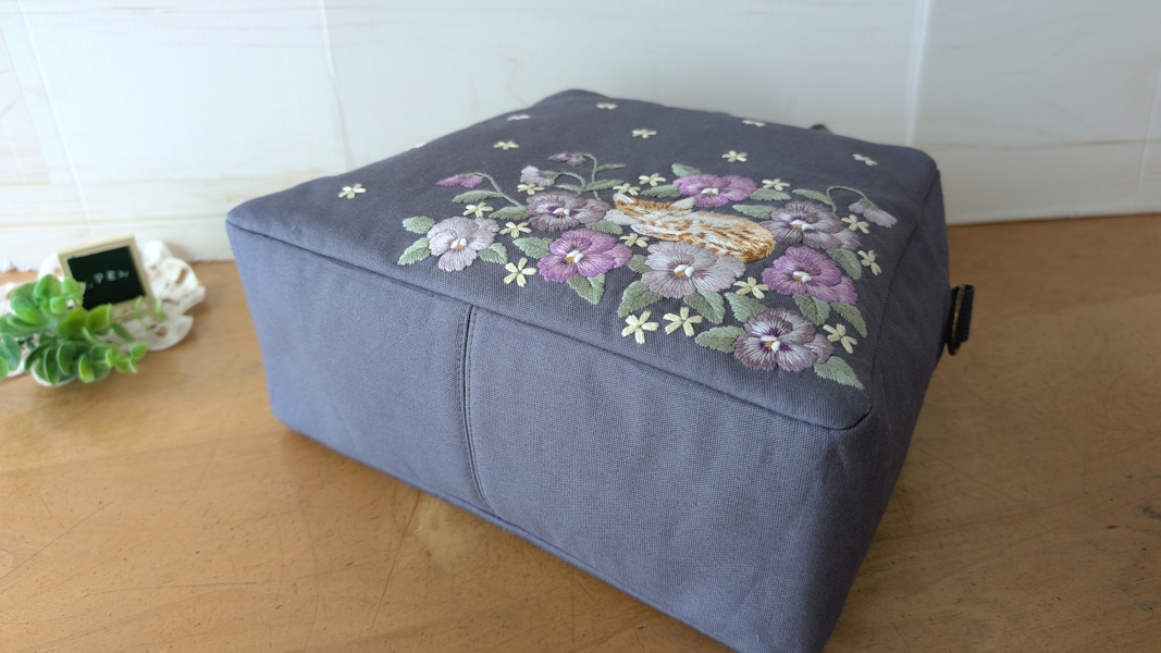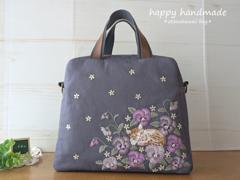 ハンドメイド♪ボストンバッグ *お昼寝猫ちゃんとビオラの手刺繍 *Dカン付きでショルダーバッグにも