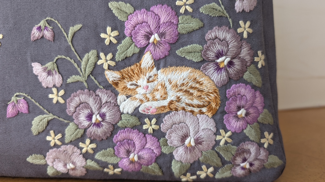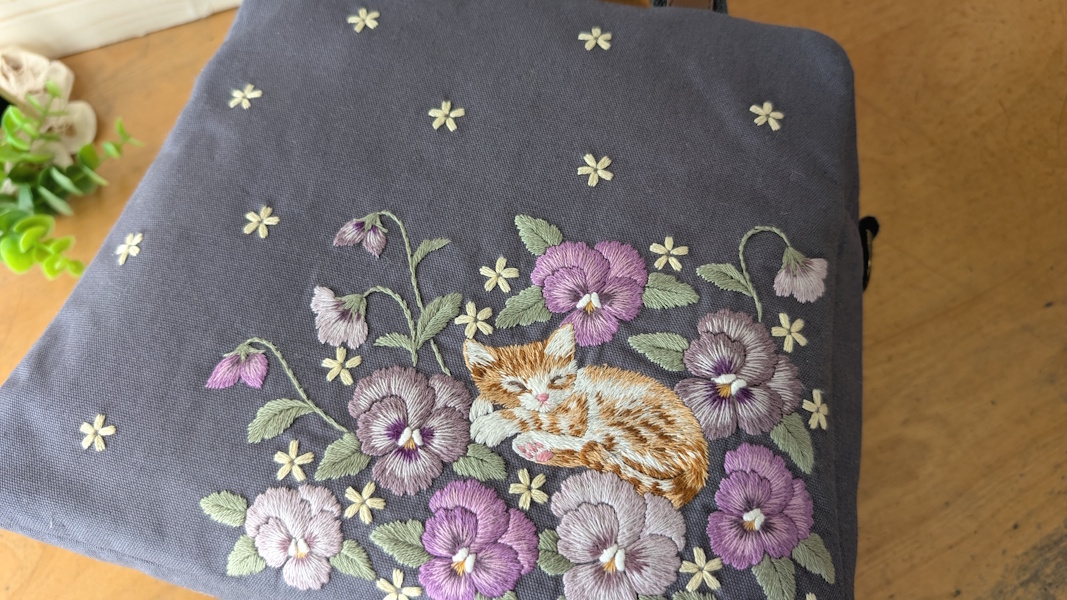 お昼寝中の猫ちゃんとビオラを手刺繍しました。