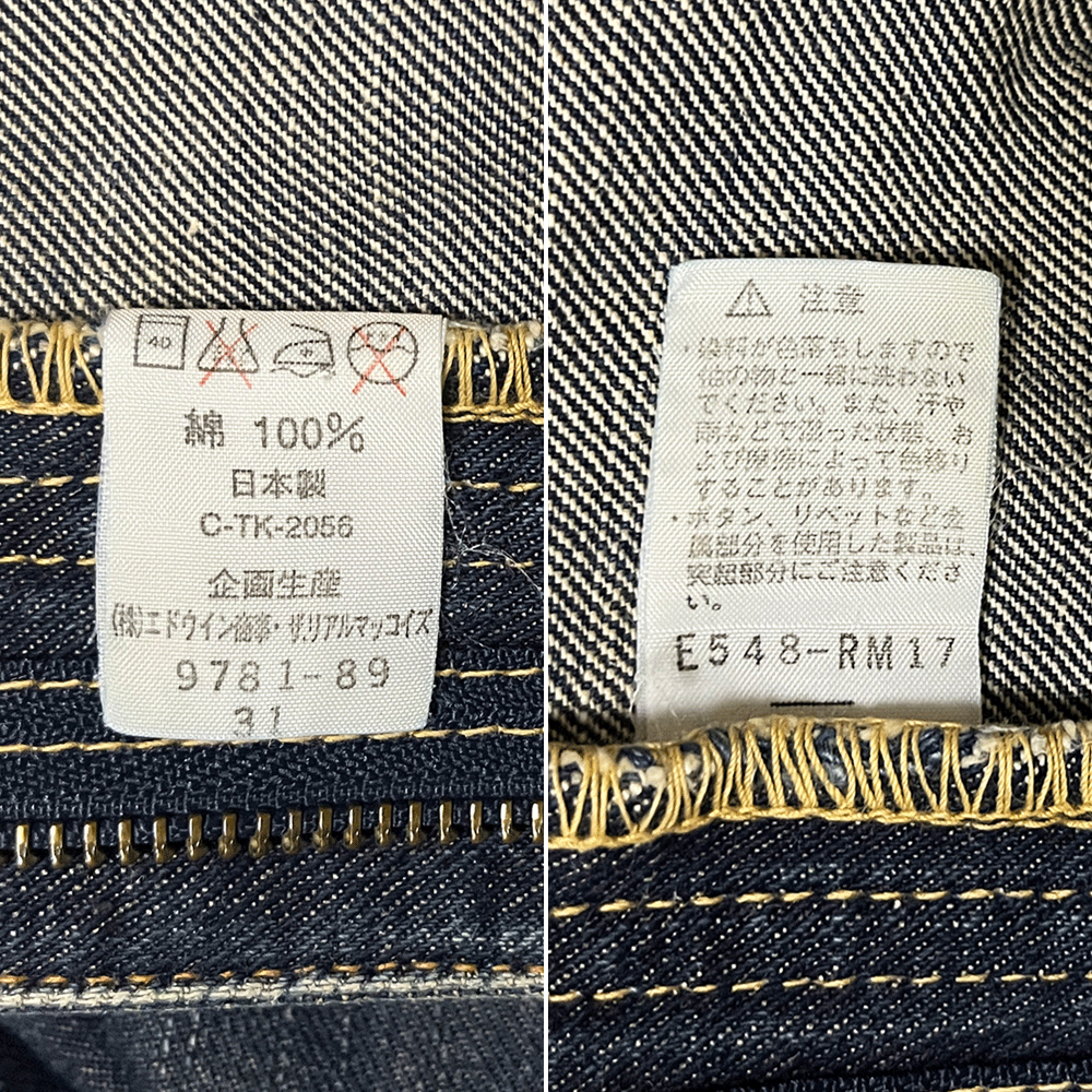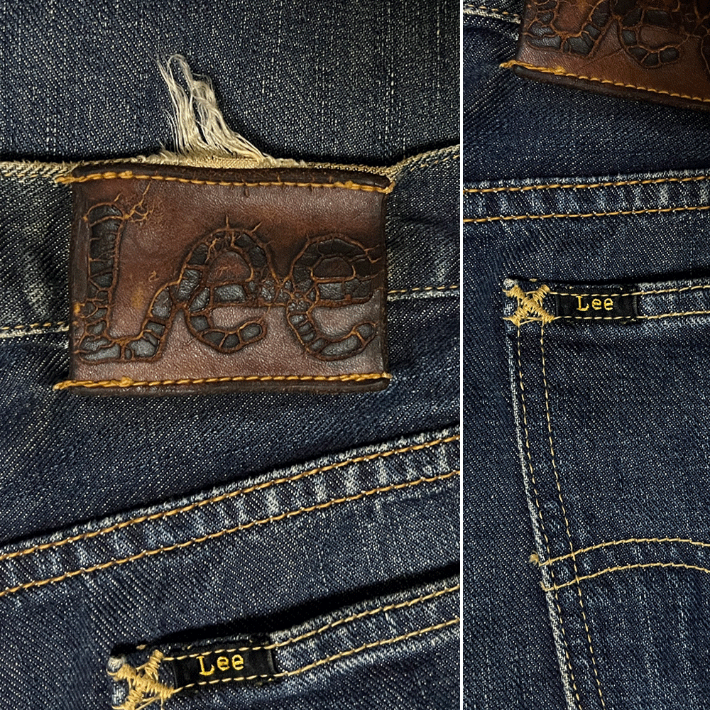 バックポケット内側に当て布付き、左バックポケット内側にユニオンチケット付きです。