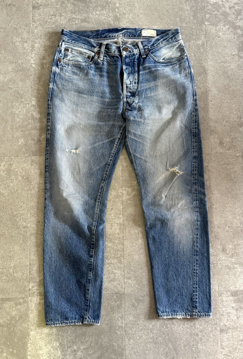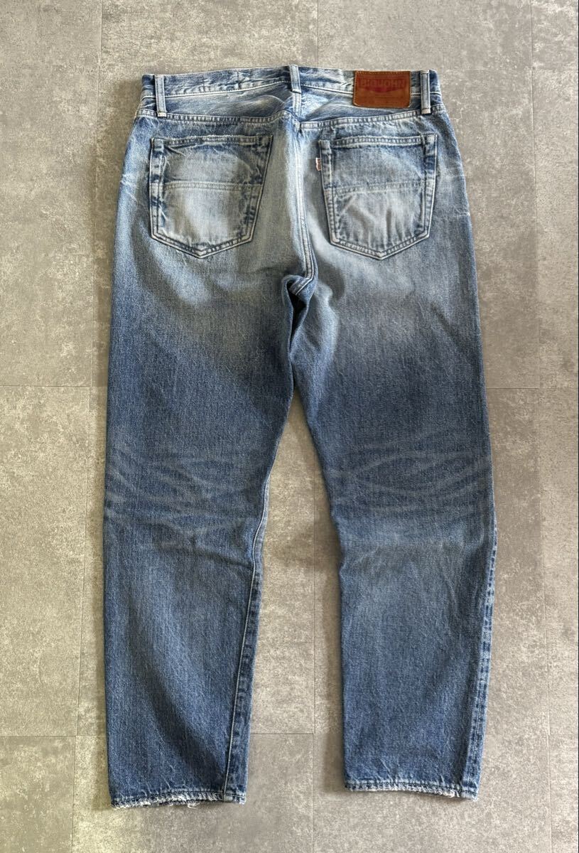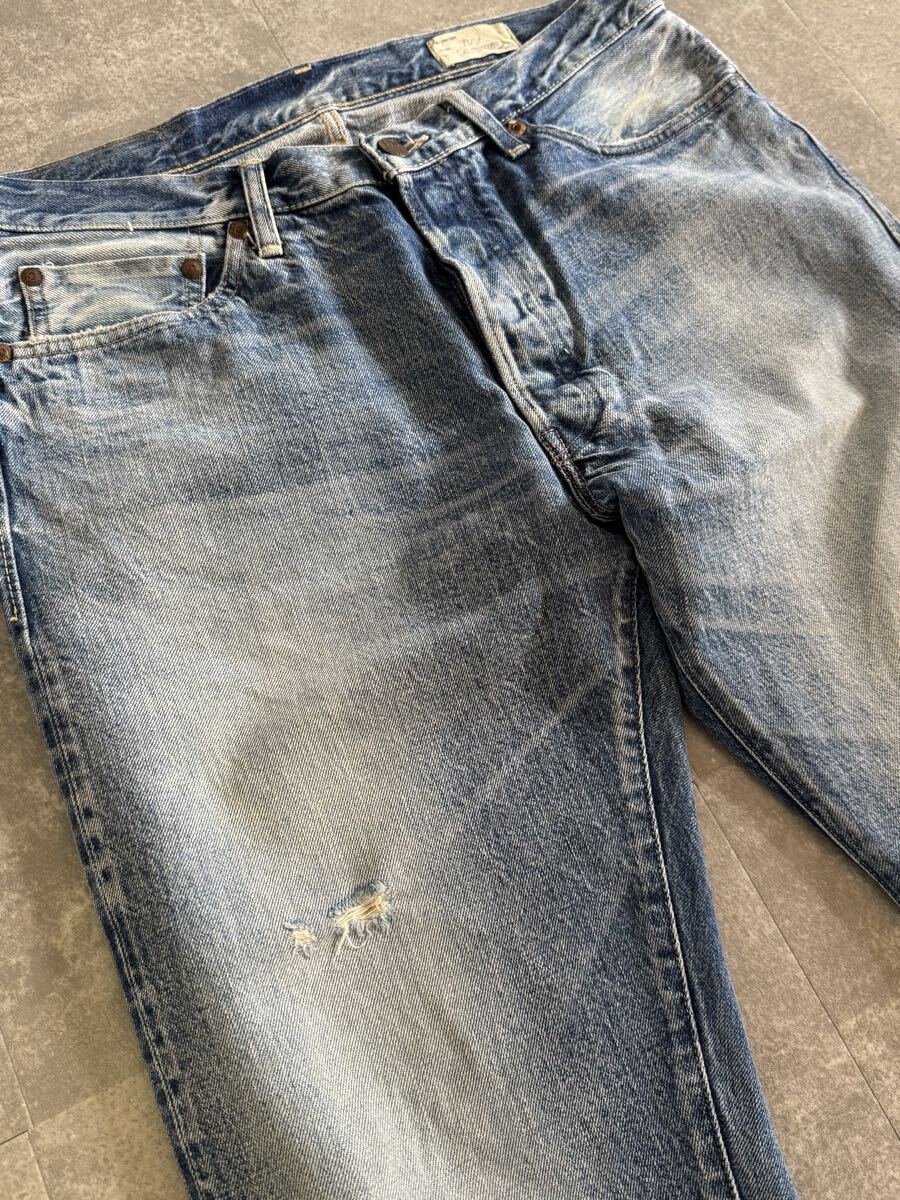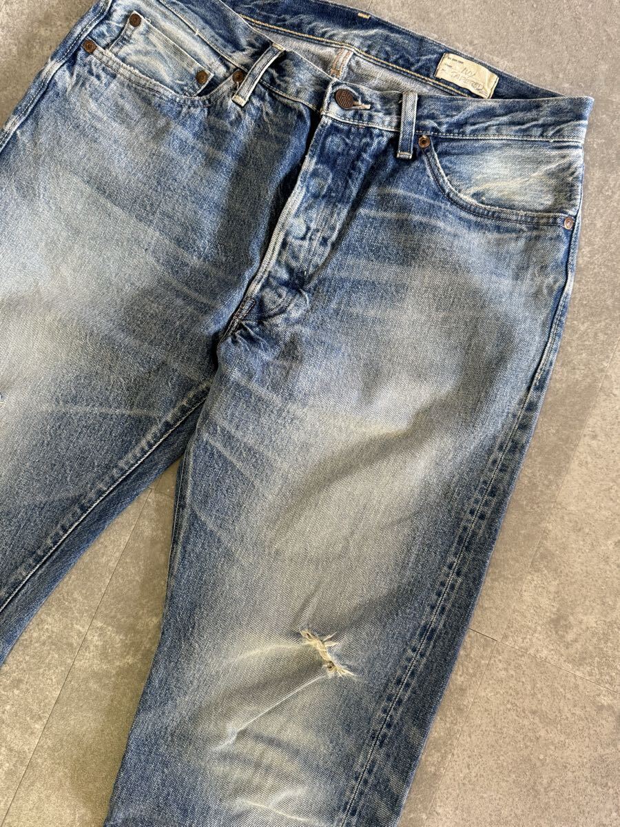 オンラインで完売中のヴィンテージウォッシュカラーです。数回洗濯しています。ゆったりとした股上に短めでテーパードが効いたよいシルエットのジーンズです。メイドインジャパンのセルビッチデニムになります。