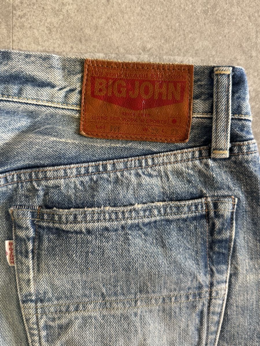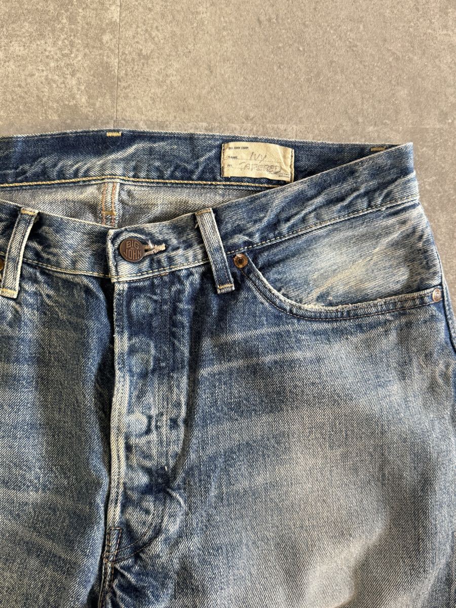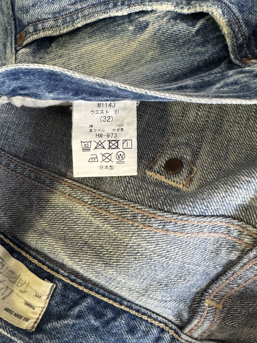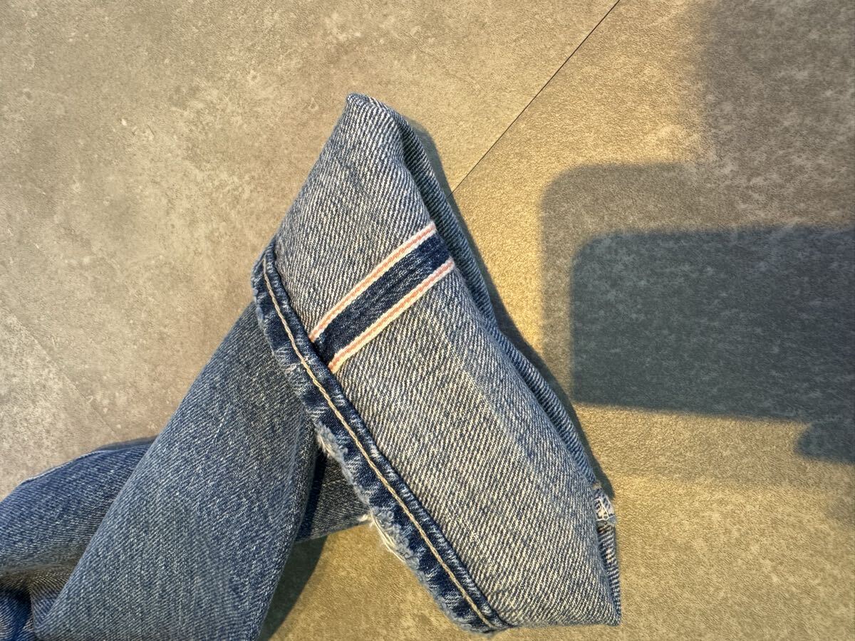 オンラインで完売中のヴィンテージウォッシュカラーです。数回洗濯しています。ゆったりとした股上に短めでテーパードが効いたよいシルエットのジーンズです。メイドインジャパンのセルビッチデニムになります。